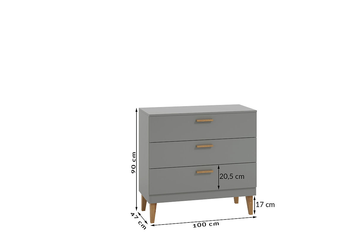 Moderní šedá komoda KUBI se 3 prostornými šuplíky. Komoda je vhodná do dětských pokojů pro děti i studenty. Nadčasový skandinávský styl komodě svědčí a skvěle se kombinuje z ostatními kusy nábytku ze stejné kolekce.