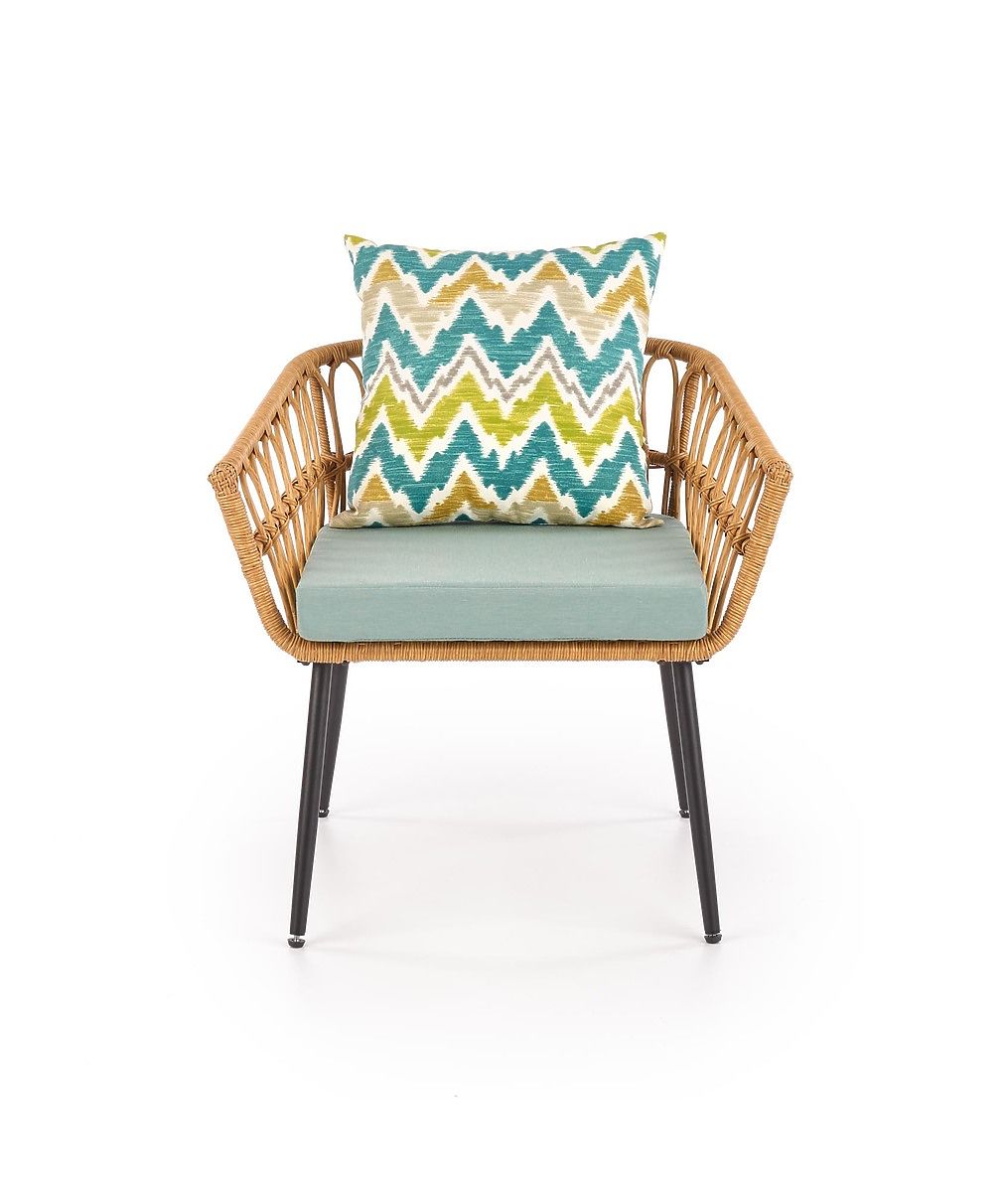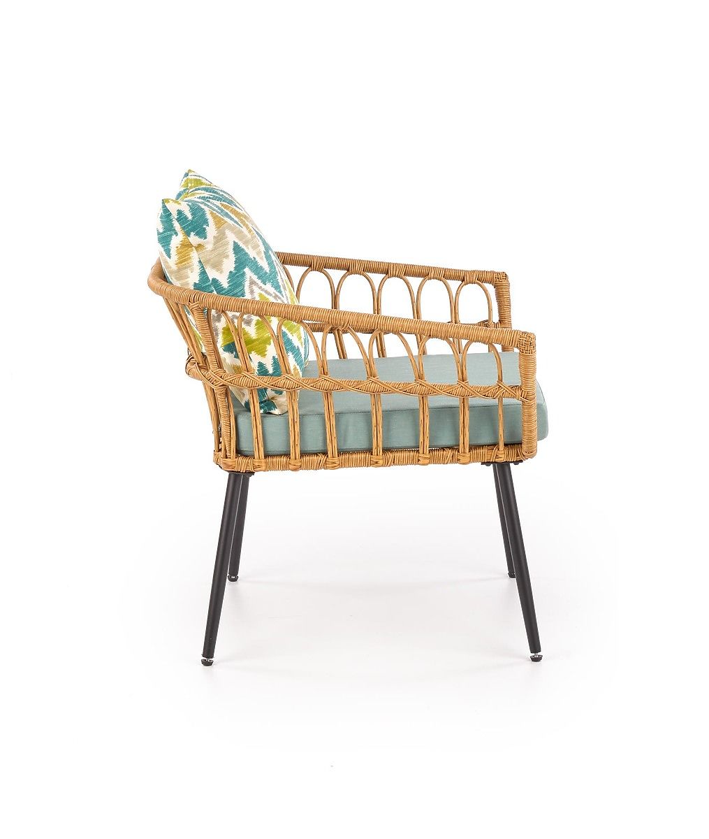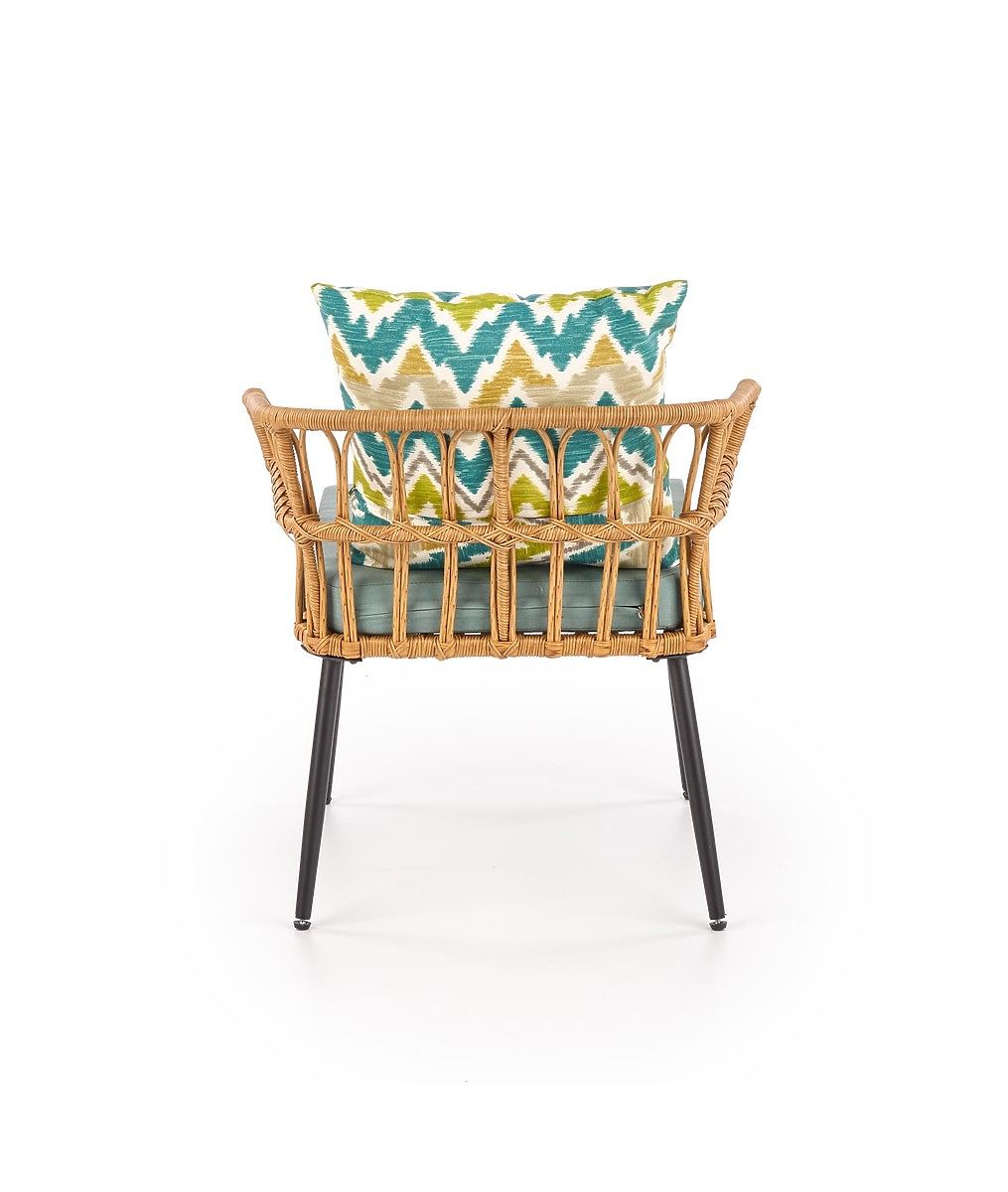 Stabilní konstrukci tvoří práškově lakovaná ocel v černé barvě, která je propletená syntetickým ratanem. Pro Vaše pohodlí je součástí balení měkký látkový sedák a barevný polštář.