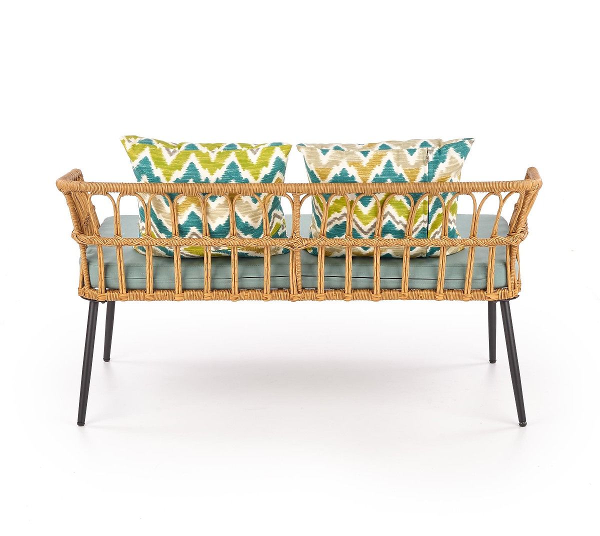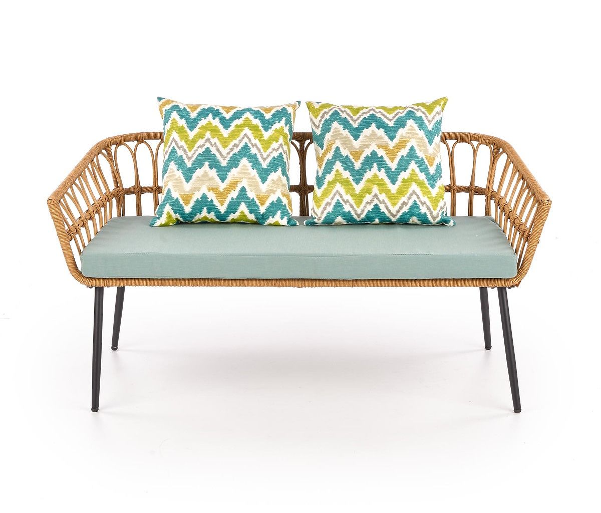 Stabilní konstrukci tvoří práškově lakovaná ocel v černé barvě, která je propletená syntetickým ratanem. Pro Vaše pohodlí je součástí balení měkký látkový sedák a dva barevné polštáře.