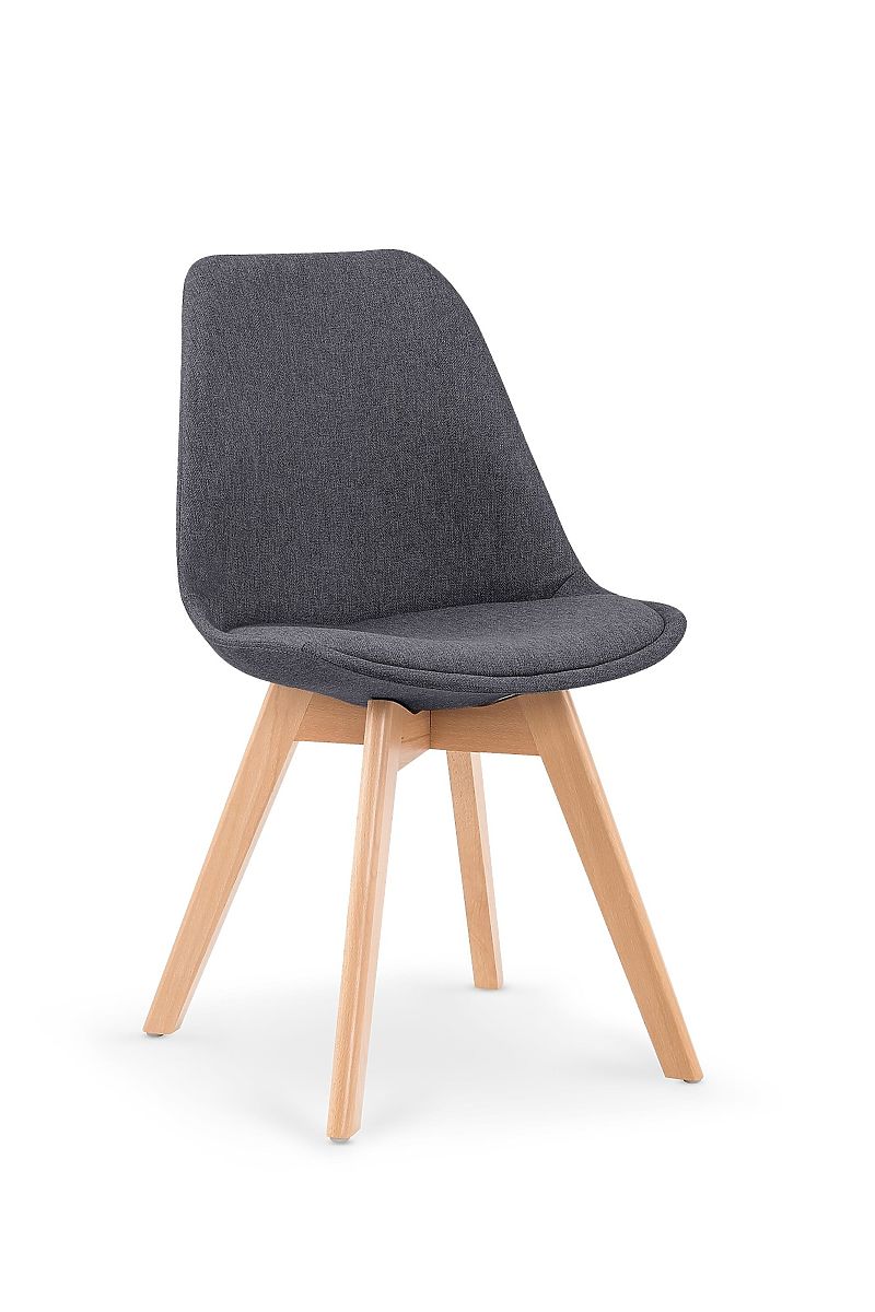 Moderní jídelní židle K303 s čalouněním z tmavě šedé látky a masivními dřevěnými nohami. .. více