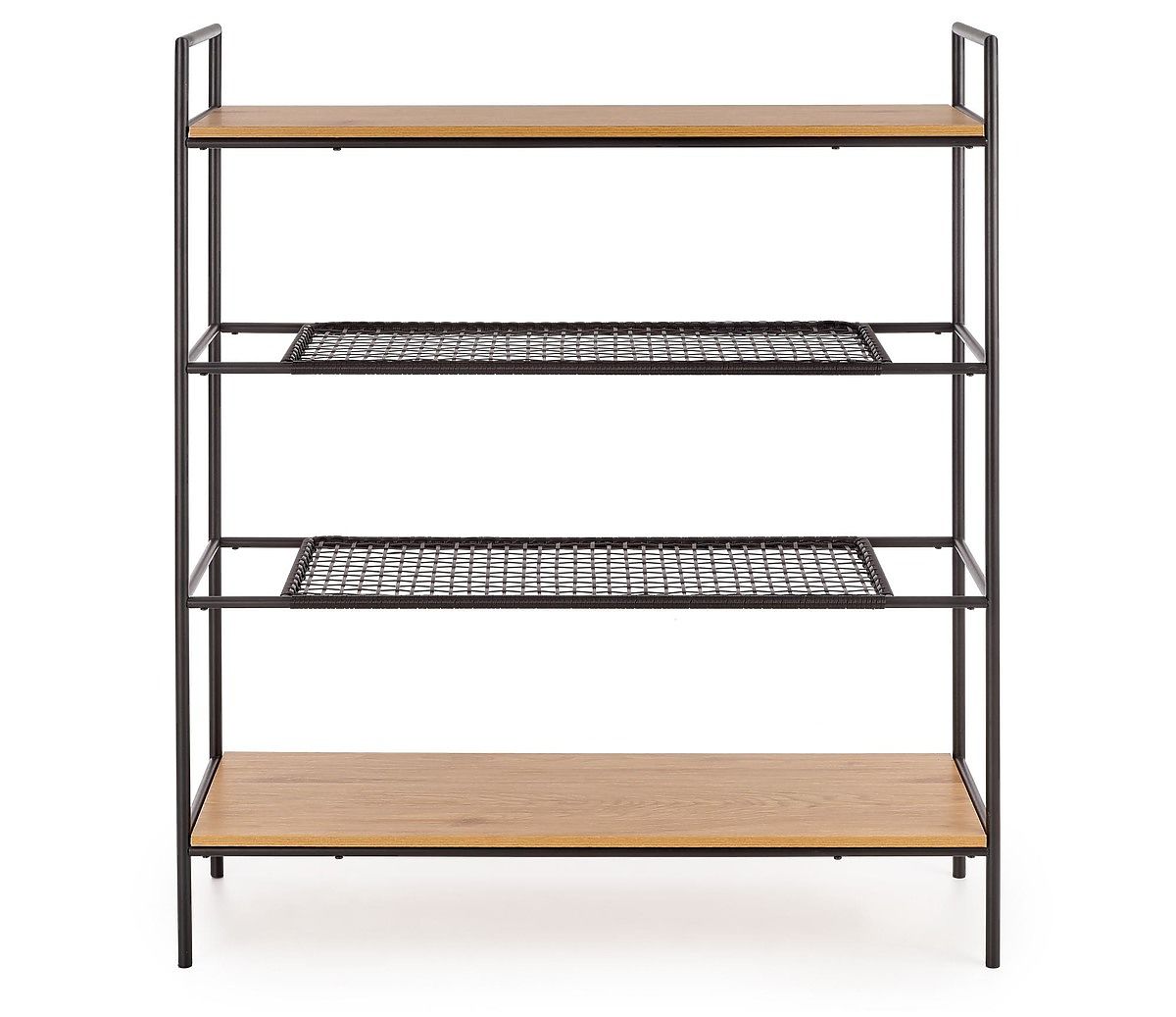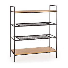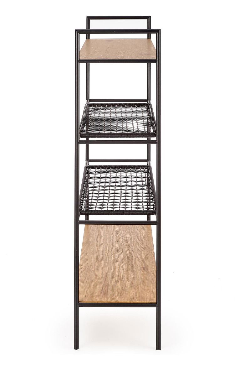 Police jsou z laminované MDF desky v barvě zlatý dub a syntetického ratanu. Konstrukce je vyrobena z práškově lakované oceli černé barvy.