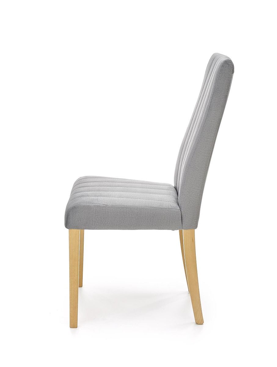 Konstrukce je vyrobena z masivního bukového dřeva v přírodní barvě. Polstrovaný sedák a opěrka jsou potaženy příjemnou sametovou látkou světle šedé barvy. Decentní prošívané pruhy židli dodají na eleganci.