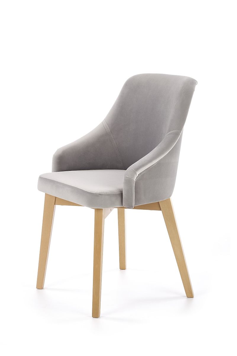 Konstrukce židle je vyrobena z masivního bukového dřeva v odstínu medový dub. Sedák i opěrák jsou čalouněny příjemnou sametovou látkou šedé barvy.