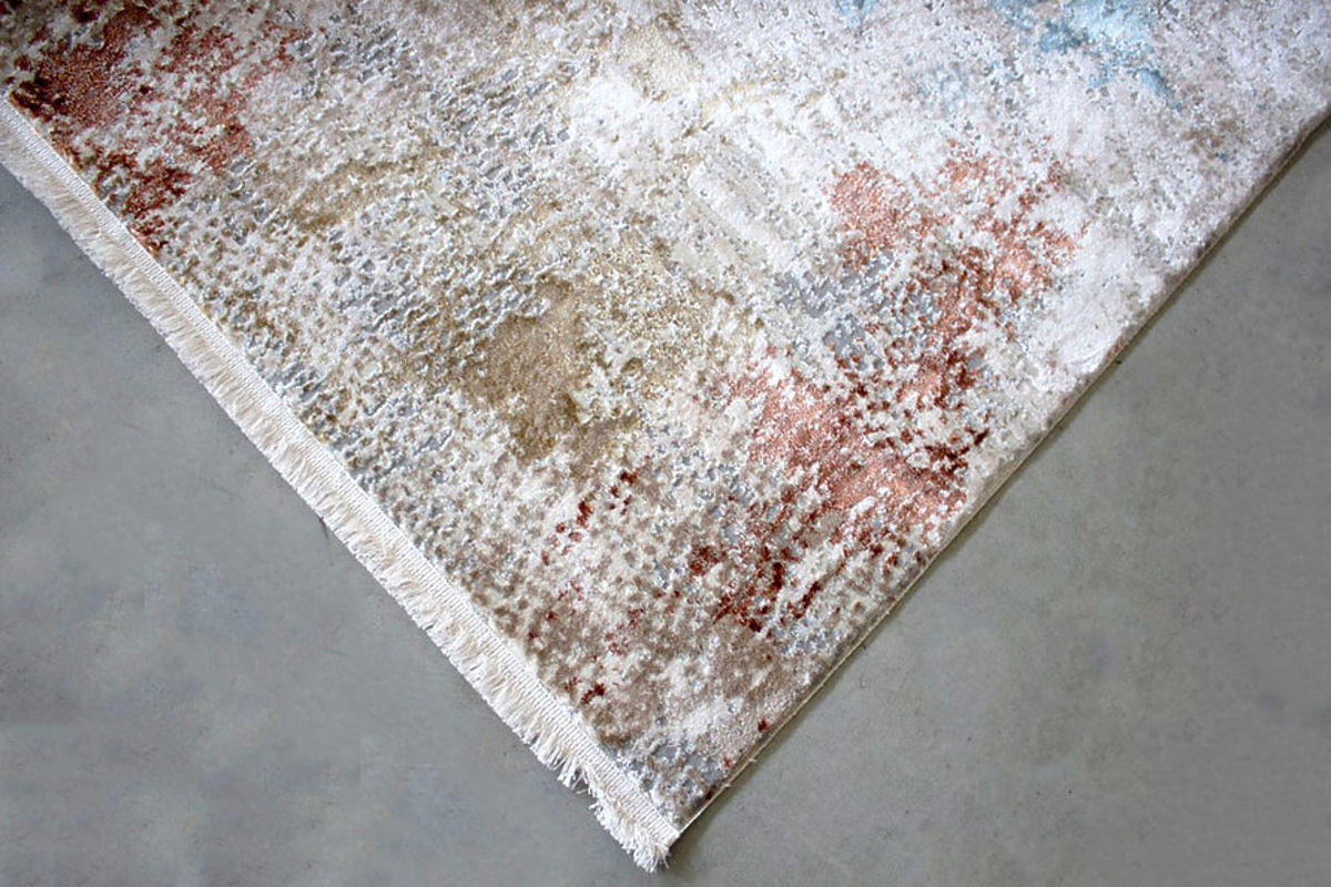 Světlý béžový podklad koberce doplněný o rozptýlené tóny cihlové a azurové barvy vytváří harmonický celek, který dodá vašemu interiéru nádech elegance.