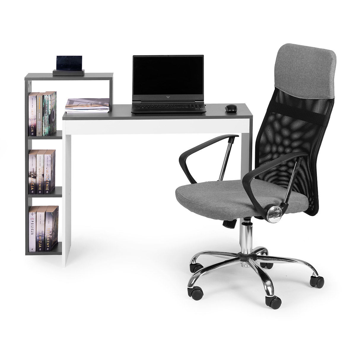 Lukafurniture.cz » Stoly a stolky / Psací stoly / Kancelářský počítačový stůl bílo-šedý + regál se 4 policemi