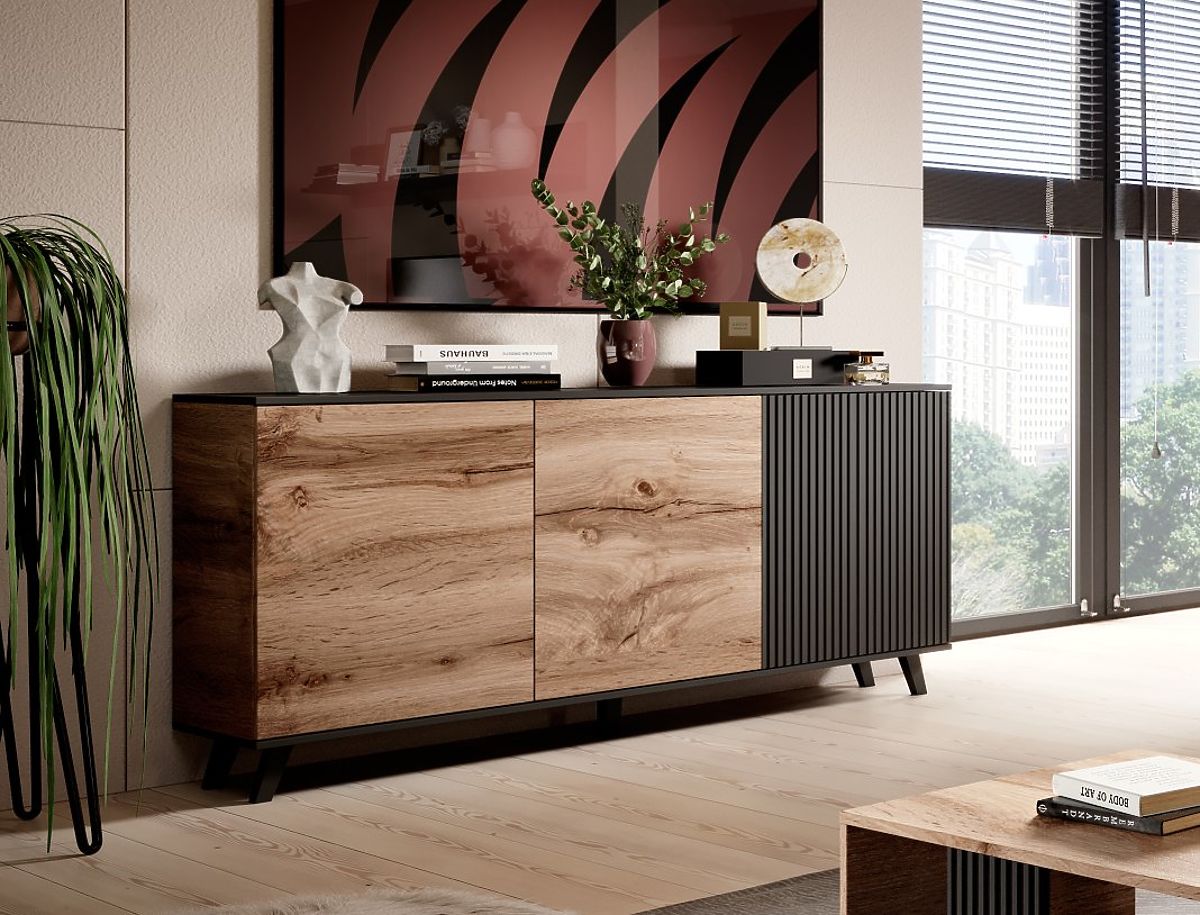 Vyrobena z kvalitních materiálů, jako je dýhovaná MDF a nábytková deska, komoda kombinuje estetiku a funkčnost. Povrchová úprava v odstínu dubu Wotan přináší přirozený a teplý vzhled, zatímco černé prvky dodávají moderní a sofistikovaný nádech.