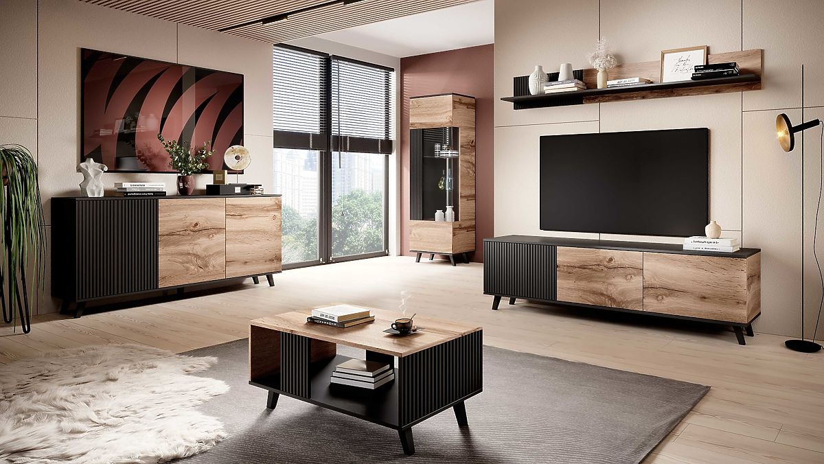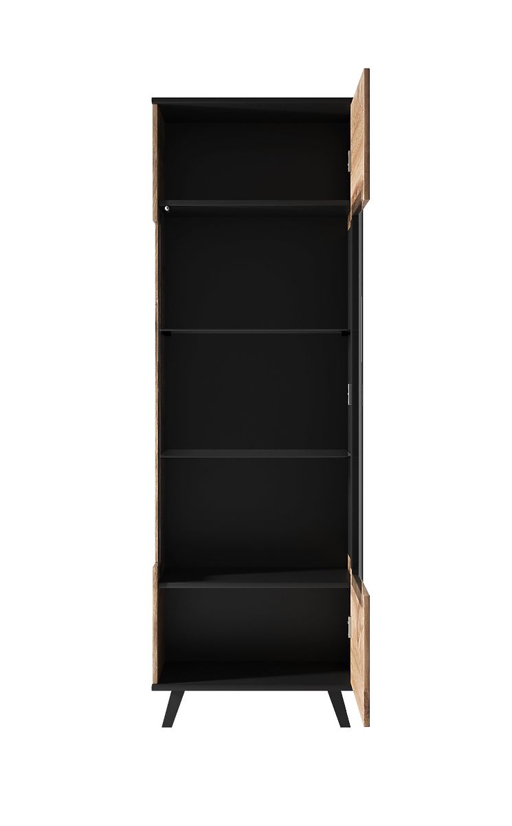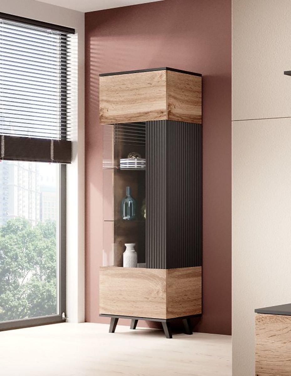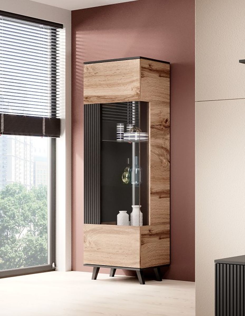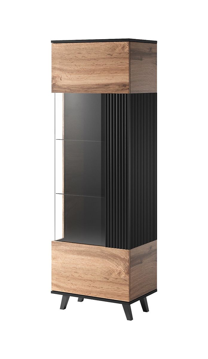 Barva: Kombinace dubu wotan a černé barvy dodává vitríně moderní a sofistikovaný vzhled, který se snadno hodí do jakéhokoli stylu interiéru.