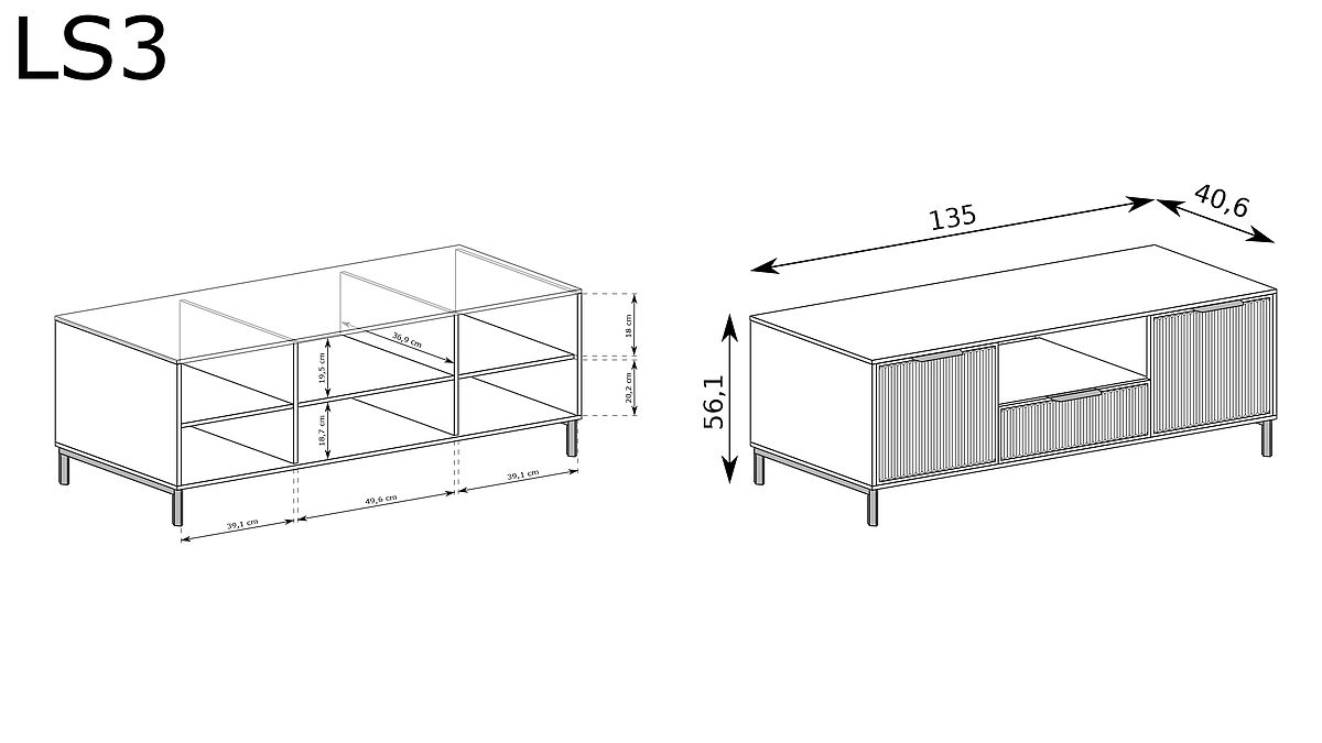 TV skříňka LS3 s rozměry 135/40,6/56 a kovovými nohami v černé barvě. .. více