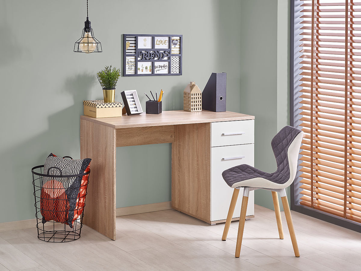 Stylový psací stůl v barvě dub sonoma/bílá, který kombinuje moderní vzhled a praktické vlastnosti. Vyroben z laminované nábytkové desky s ABS hranami, je ideální pro efektivní práci a organizaci.