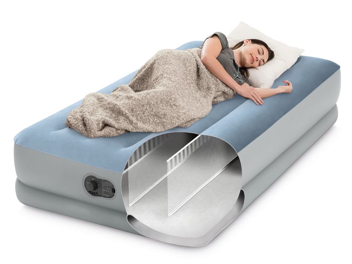 MODERNÍ TECHNOLOGIE FIBER-TECHTechnologie Fiber-Tech je inovativní řešení vyvinuté firmou INTEX, které výrazně zvyšuje kvalitu a trvanlivost matrace. Namísto tradičních vzduchových komor je vnitřní konstrukce založena na stovkách ultra-pevných polyesterových vláken, které tvoří jednotnou, stabilní strukturu. Co je nejdůležitější – tato vlákna se časem neroztahují, díky čemuž matrace zachovává svůj tvar a vlastnosti i po mnoha cyklech nafukování a používání. Díky technologii Fiber-Tech uživatel pocítí komfort srovnatelný s tradiční postelí, což činí matraci ideální jak pro každodenní spánek, tak pro příležitostný odpočinek.