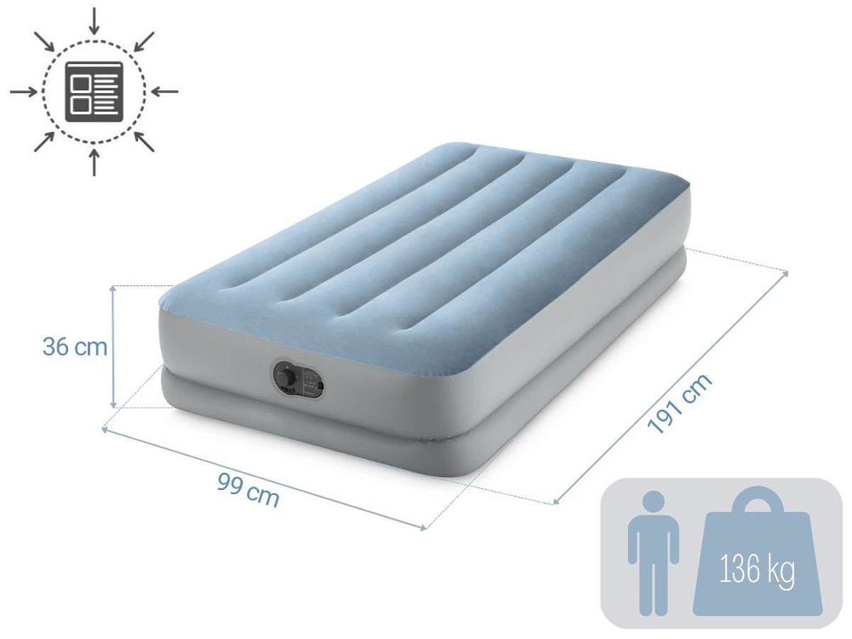 Nafukovací matrace INTEX 64157 je ideálním řešením v každé situaci – skvěle poslouží jako dočasná postel pro hosty, pohodlné místo na spaní na cestách, a také jako komfortní lůžko na kempování nebo v letním domku. Díky velkým rozměrům a pevné konstrukci poskytuje vysoký komfort spánku pro jednu dospělou osobu, bez rizika propadnutí nebo ztráty vzduchu. Rychlé nafouknutí a kompaktní skladování činí z této matrace praktickou a univerzální volbu pro každého, kdo oceňuje pohodlí a mobilitu.