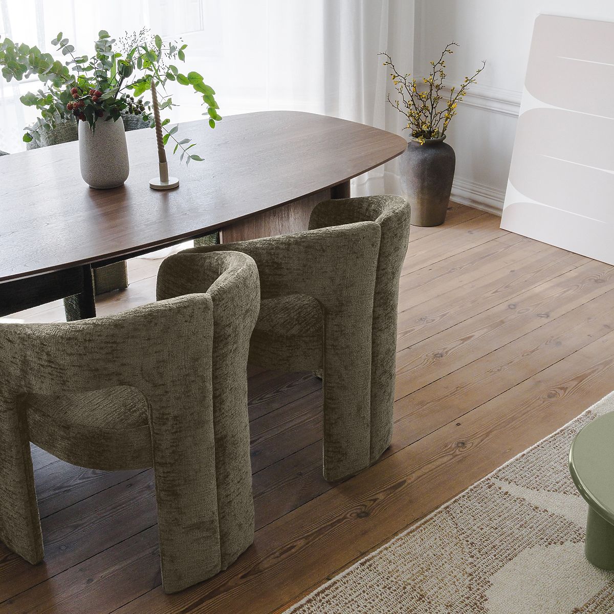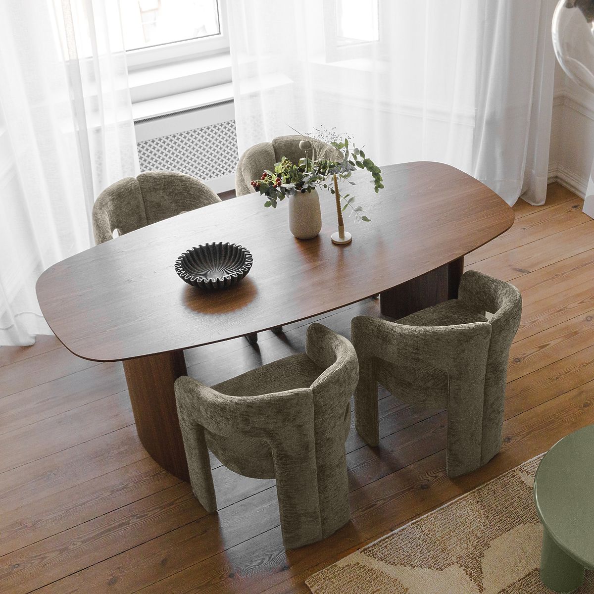 Čalouněná židle Castelo s měkkým zeleným čalouněním a zaoblenými tvary. .. více