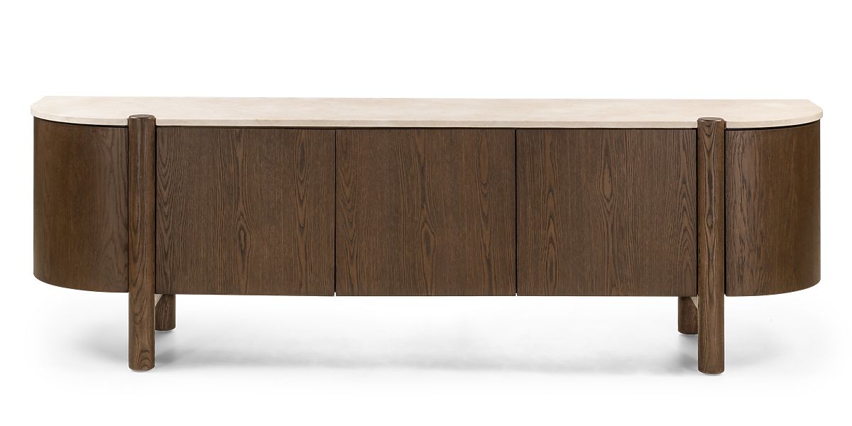 Zaoblená TV skříňka Bruna s pěti skříňkami a mramorovou deskou. .. více