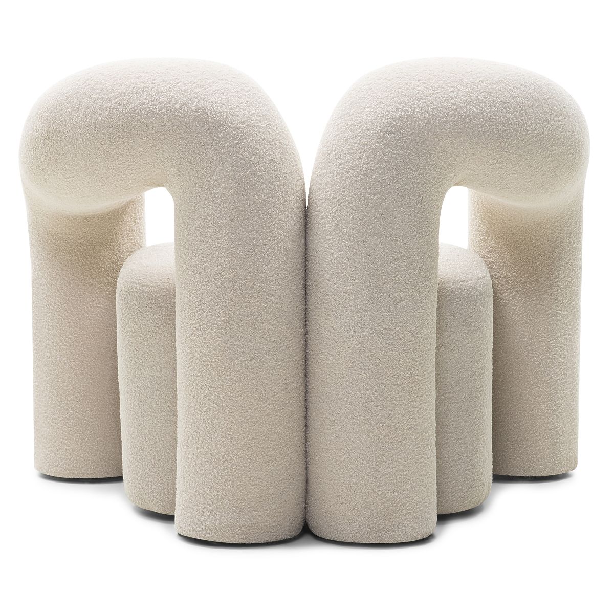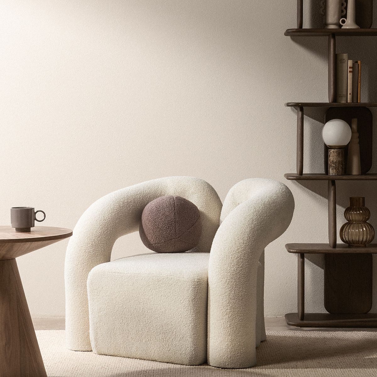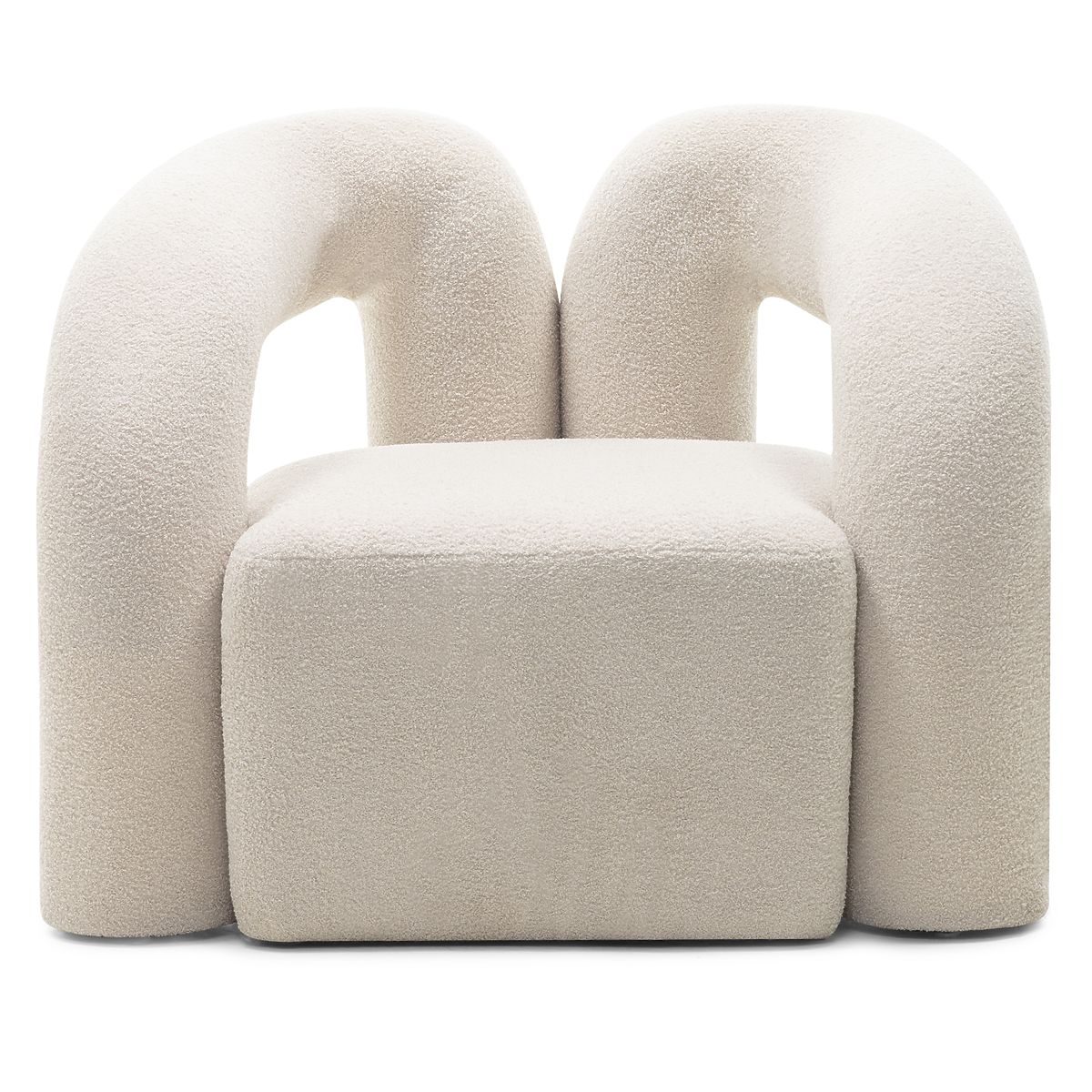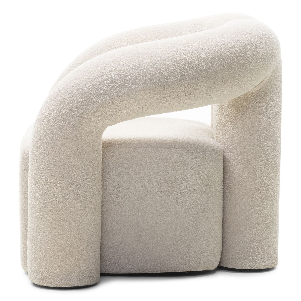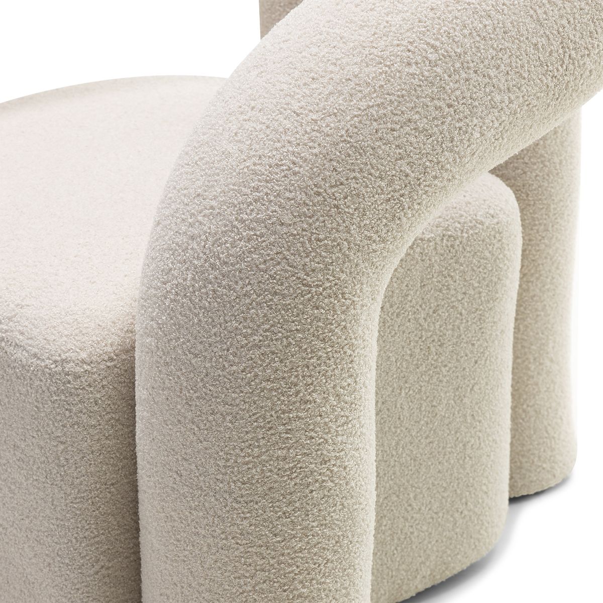 Světle béžové křeslo Merry s oblými tvary a boucle potahem. .. více