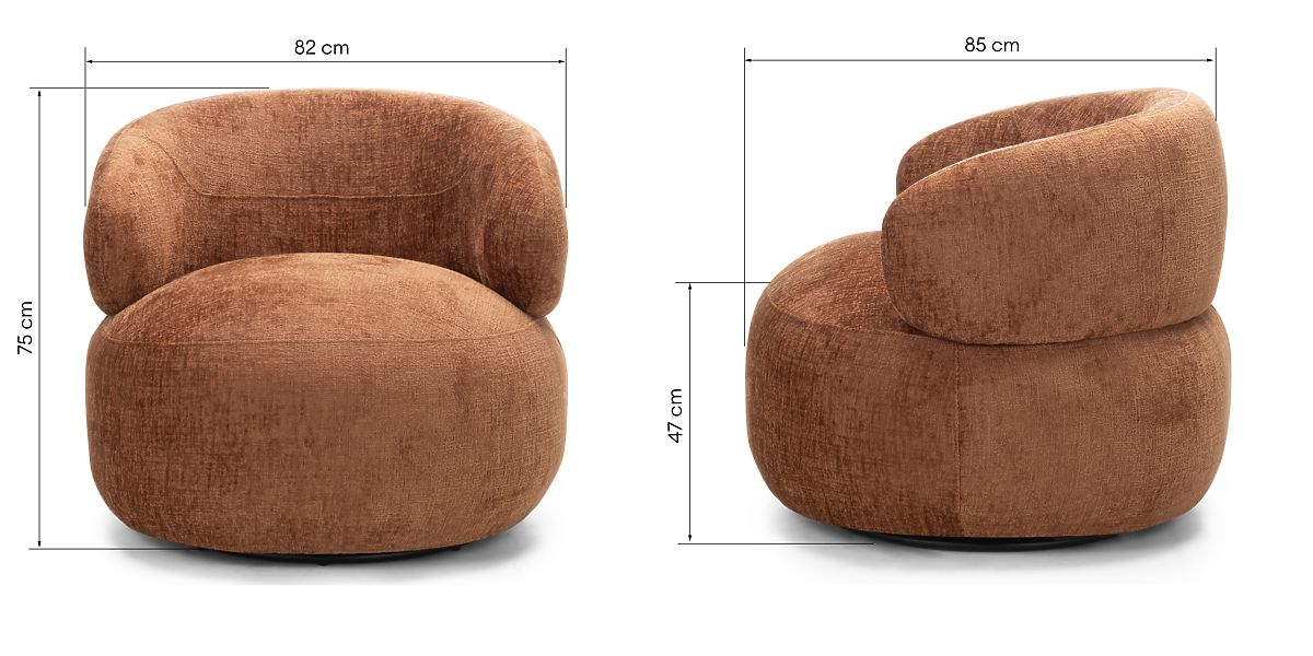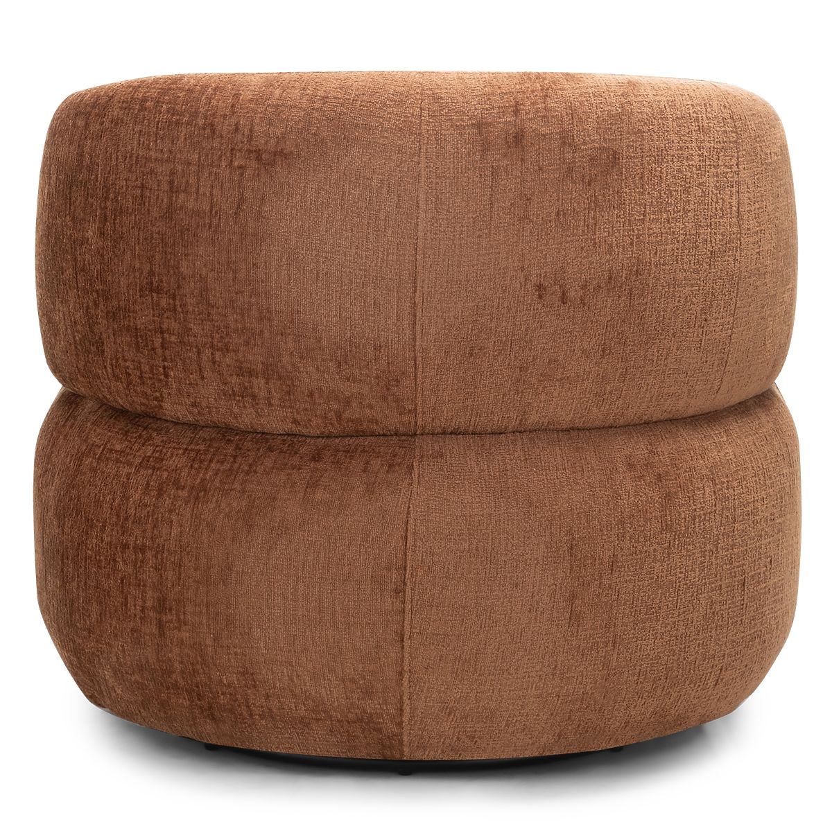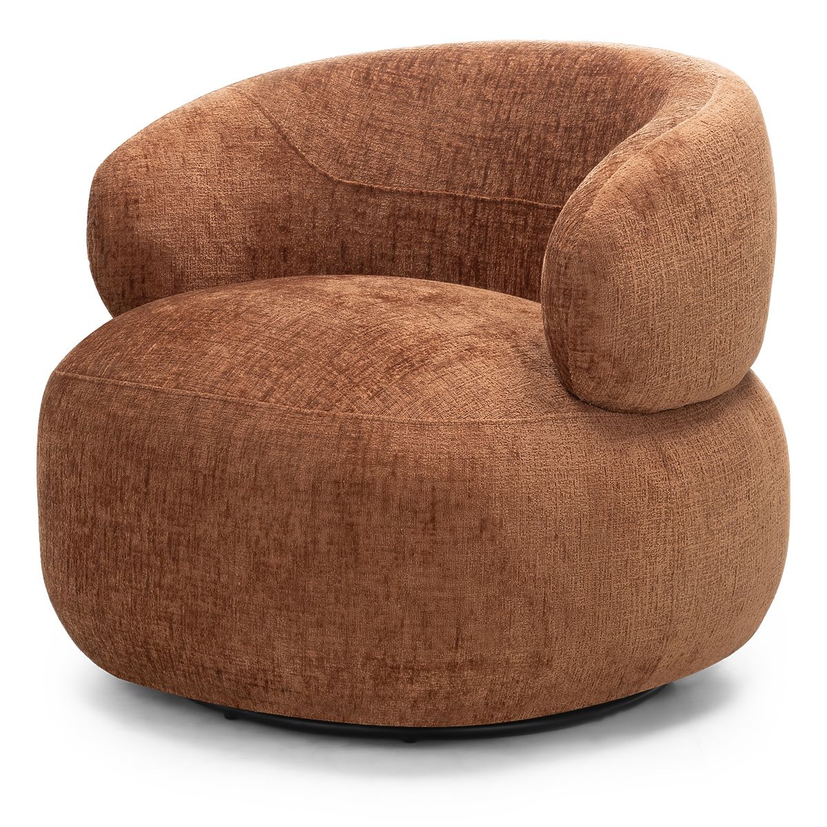 Otočná židle Rumble s měděným potahem a oblými tvary. .. více