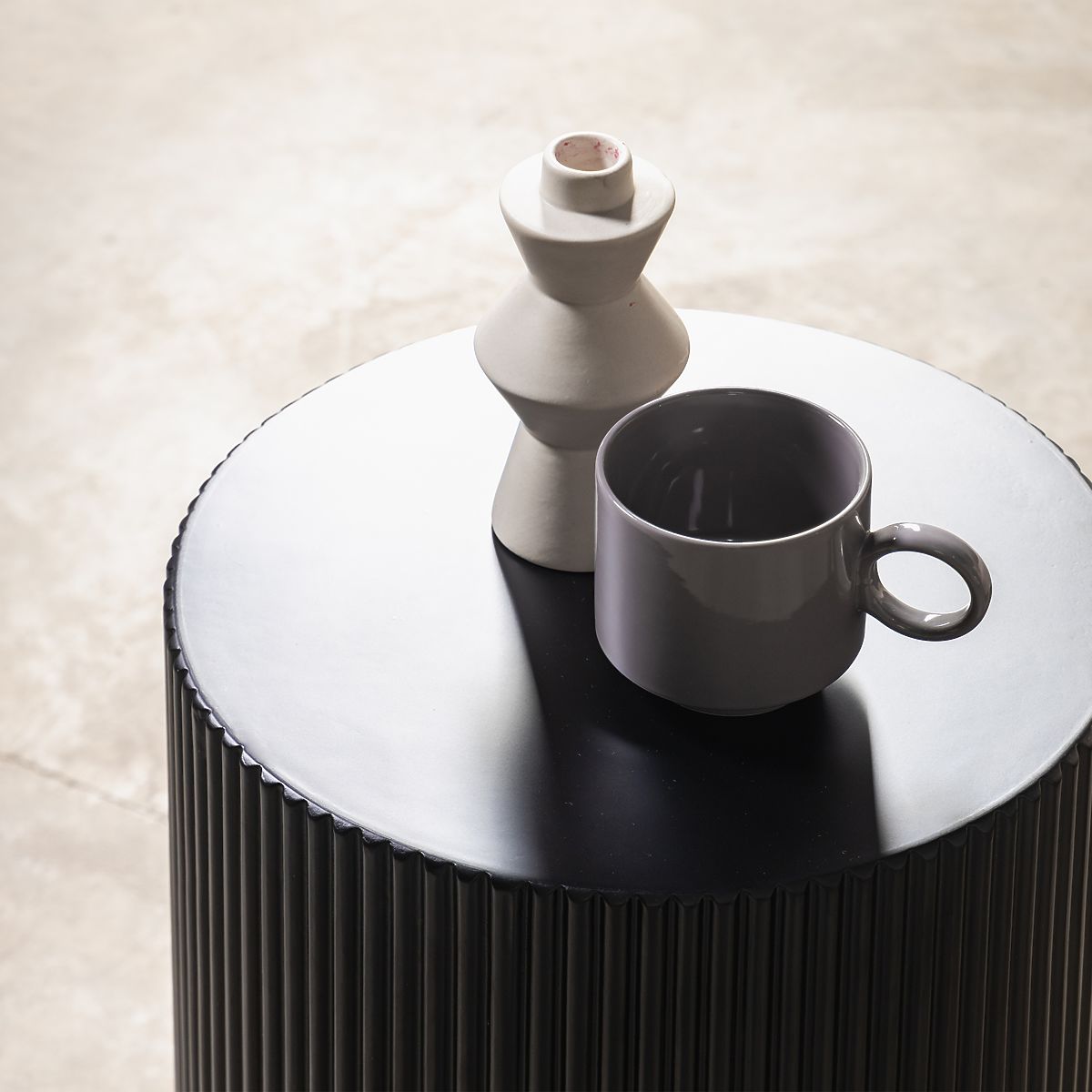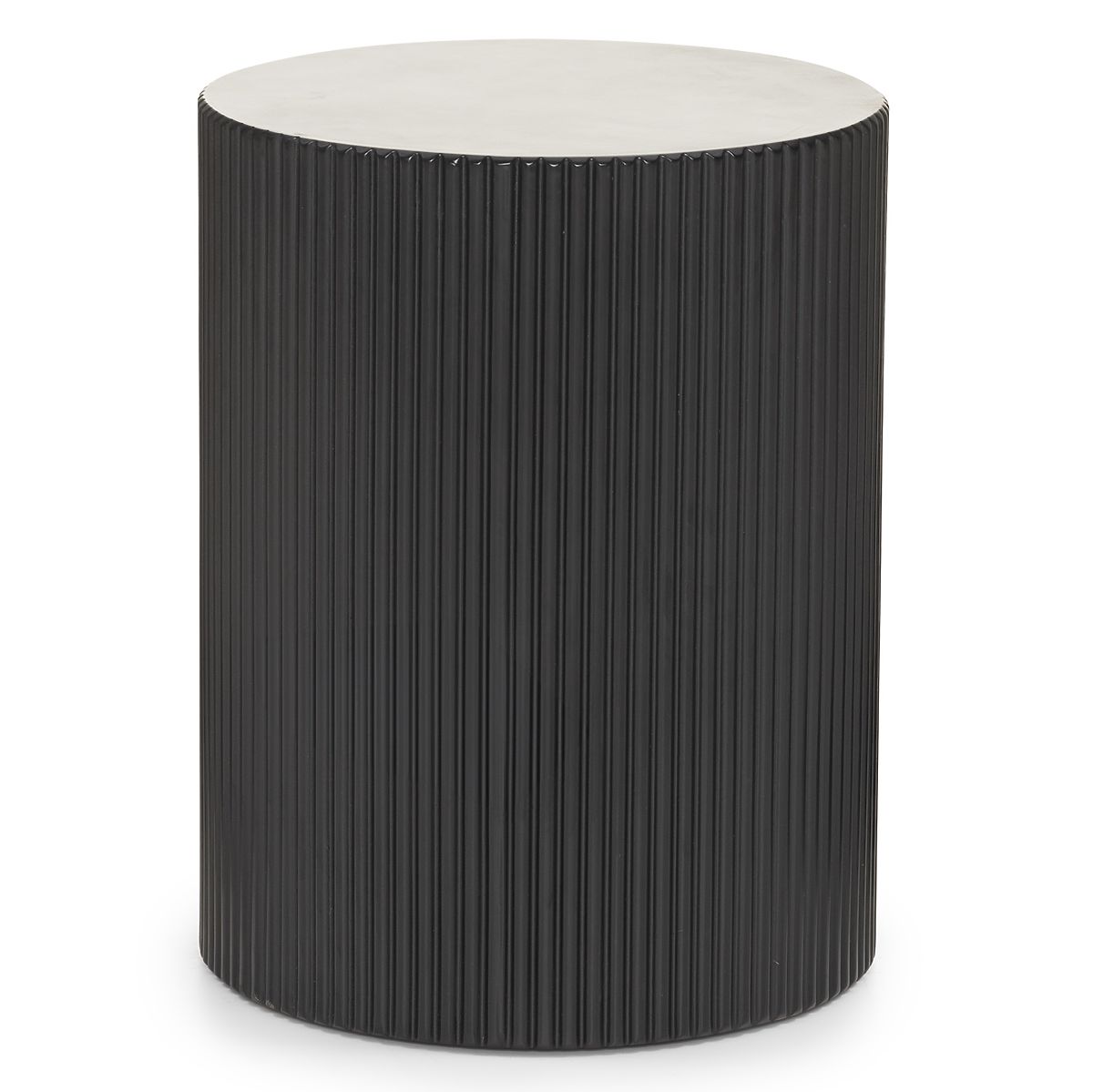 Černý boční stolek s rýhováním a kulatou deskou. .. více