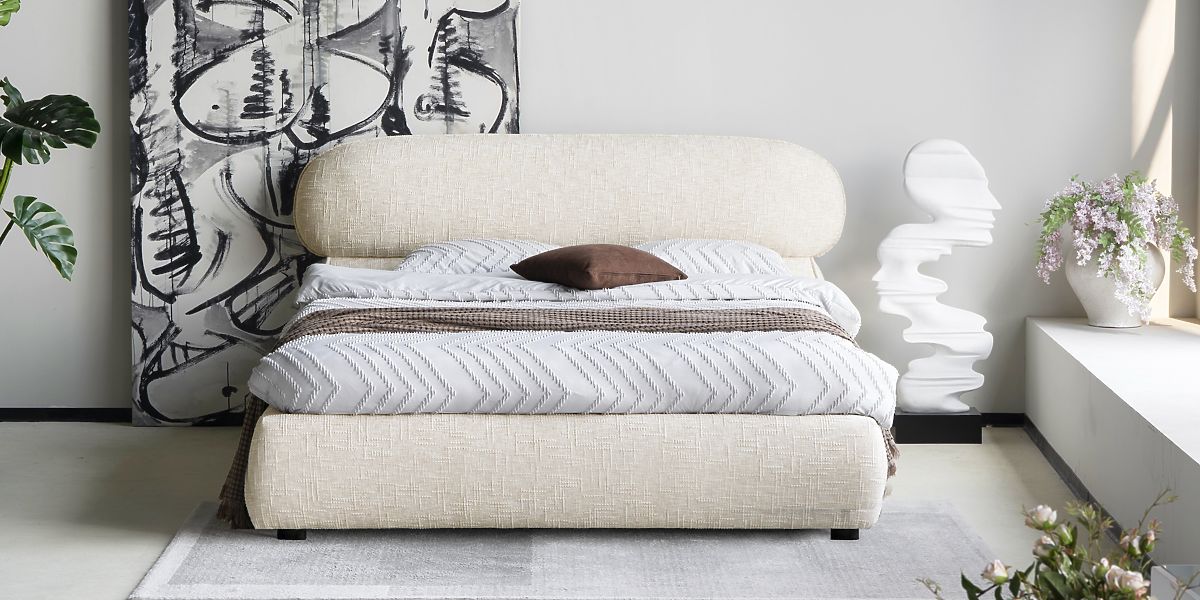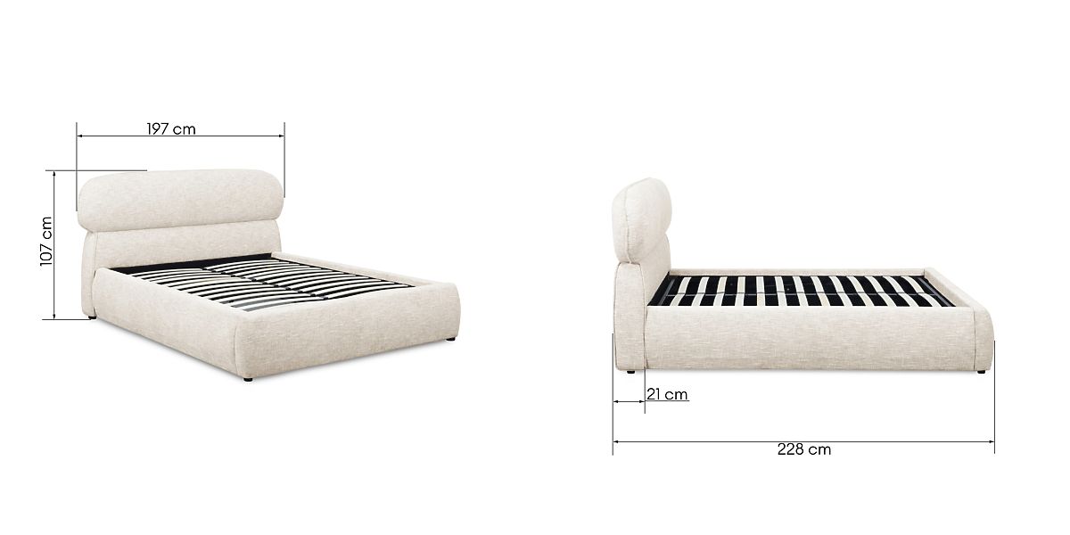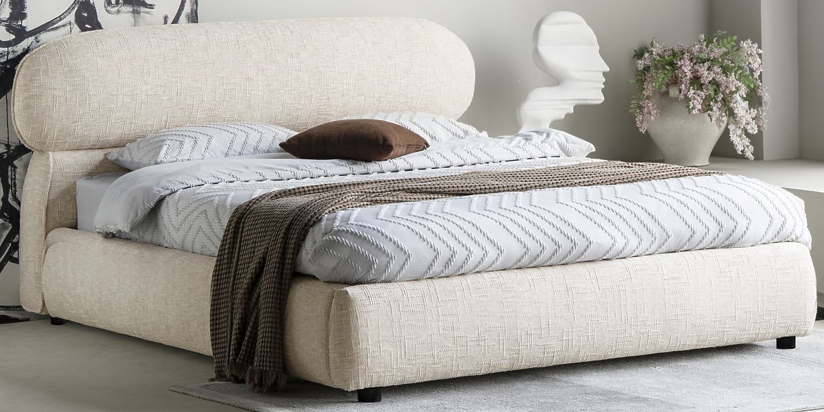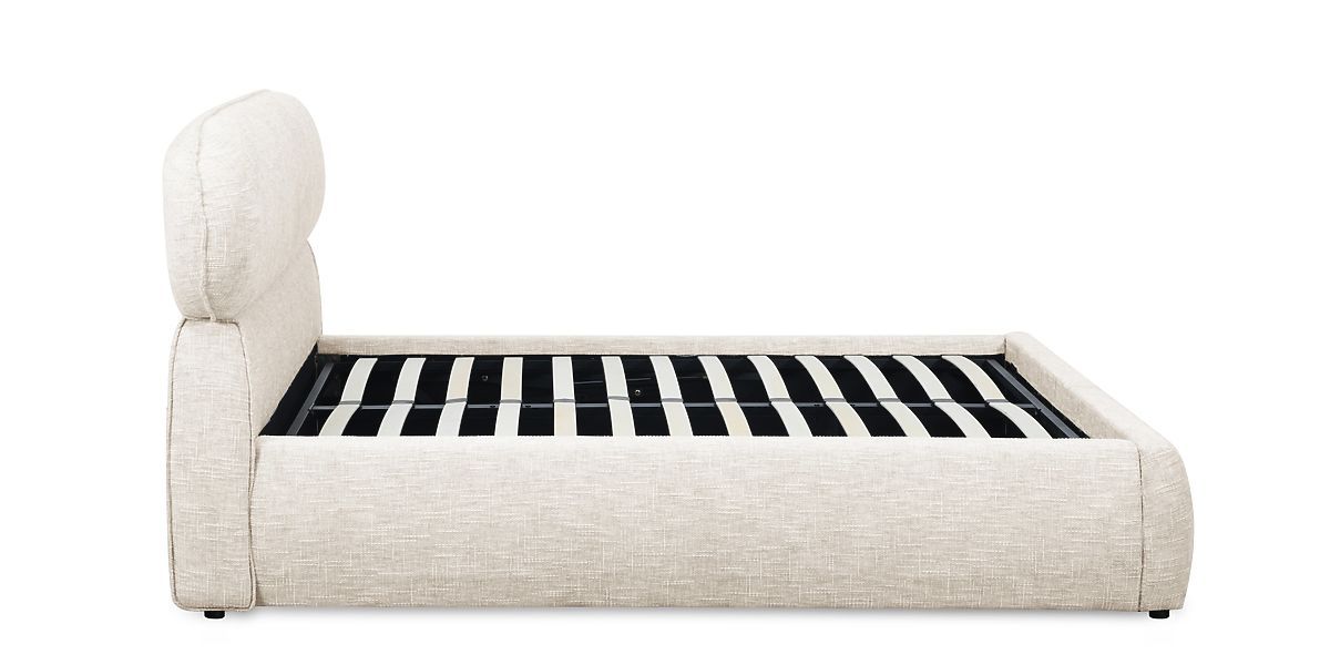 Čalouněná postel Avola se světle béžovým potahem a úložným prostorem. .. více