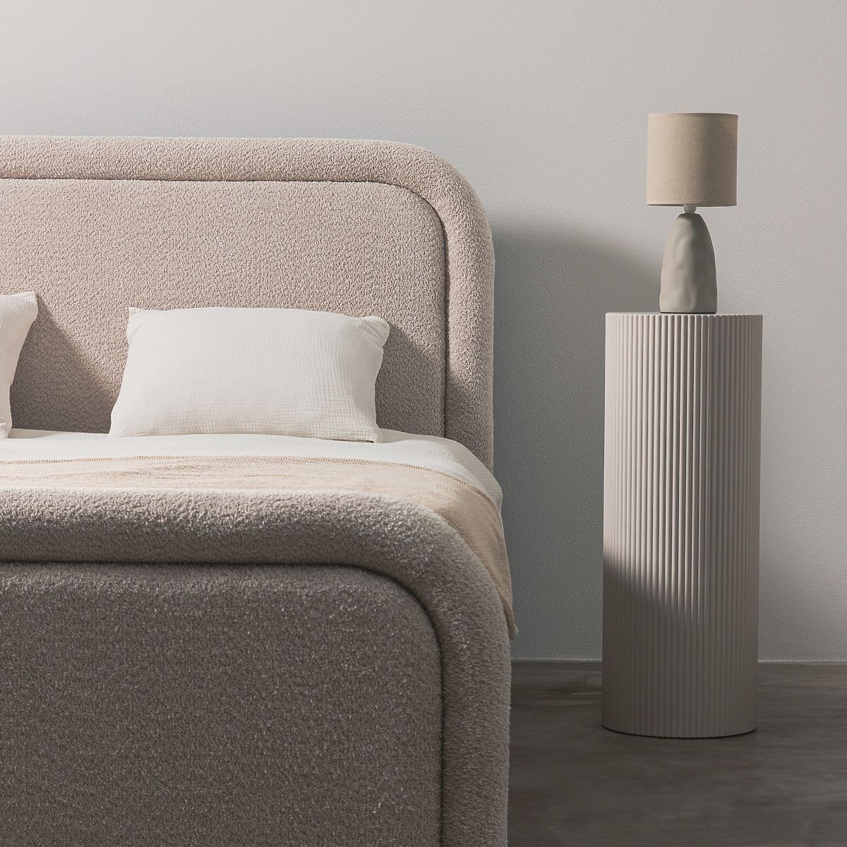 Čalouněná postel Ovoid 140x200 cm, s roštem a úložným prostorem, zaoblená, béžová
