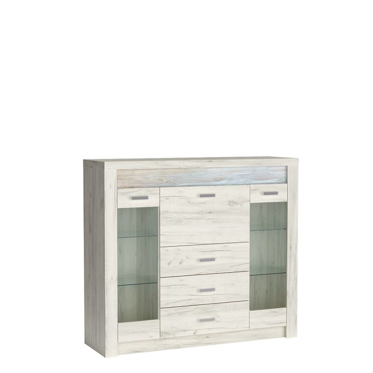 je možné zakoupit LED osvětlení desky nebo LED police; rozměry: 137/42/122 materiál: deska – laminovaná nábytková deska; hrany – ABS hrana; zadní část skříně – HDF deska; tvrzené sklo; úchyty – kovové; závěsy – kovové;