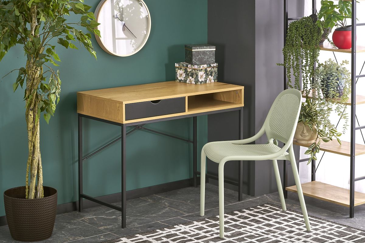 Psací stůl B-50 je ideální volbou pro školáky, studenty i domácí pracovní kout. Díky svému jednoduchému, ale modernímu designu v dekoru zlatý dub doplněném o černé kovové nohy snadno zapadne do každého interiéru – od studentského pokoje až po domácí kancelář. Stůl nabízí praktické úložné řešení v podobě jedné zásuvky a otevřené police, kam můžete uložit sešity, knihy, kancelářské potřeby či drobnou elektroniku. Pracovní plocha je dostatečně velká pro notebook, lampu i další nezbytnosti. Lamino použitá na výrobu stolu je odolné proti poškrábání, promáčknutí i znečištění, což zajišťuje dlouhou životnost a snadnou údržbu.
