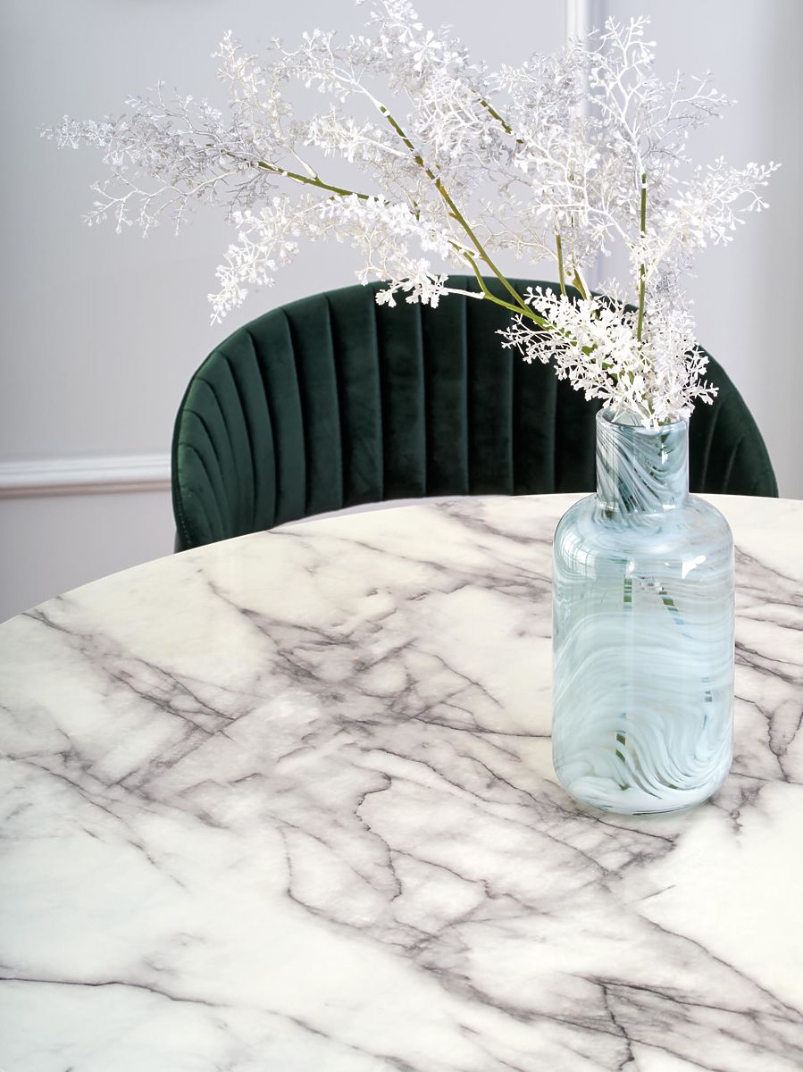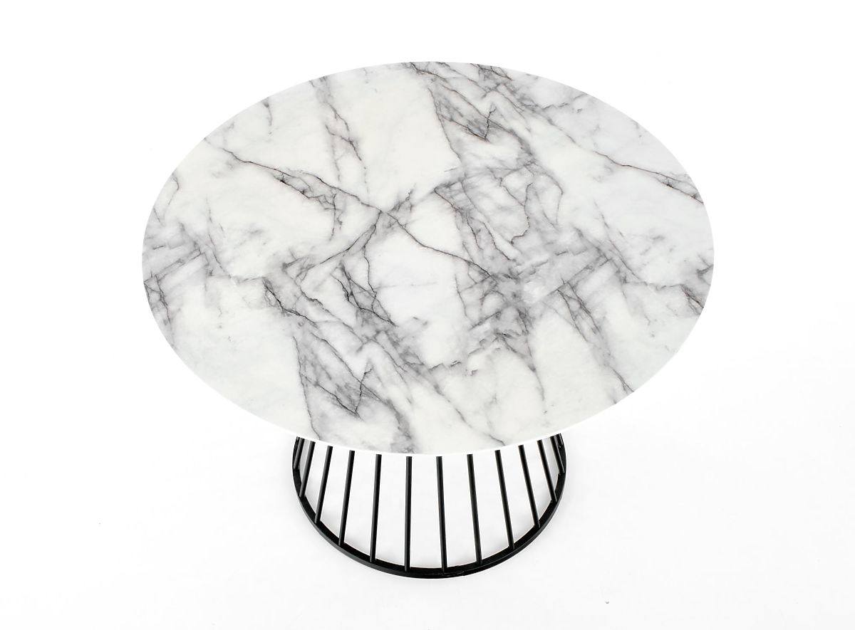 Horní deska z dýhované MDF je opatřena dekorem bílého mramoru, který dodává stolu luxusní a nadčasový charakter. Kulatý tvar podporuje pohodlné stolování až pro 4 osoby a přispívá k příjemné atmosféře při společných chvílích.