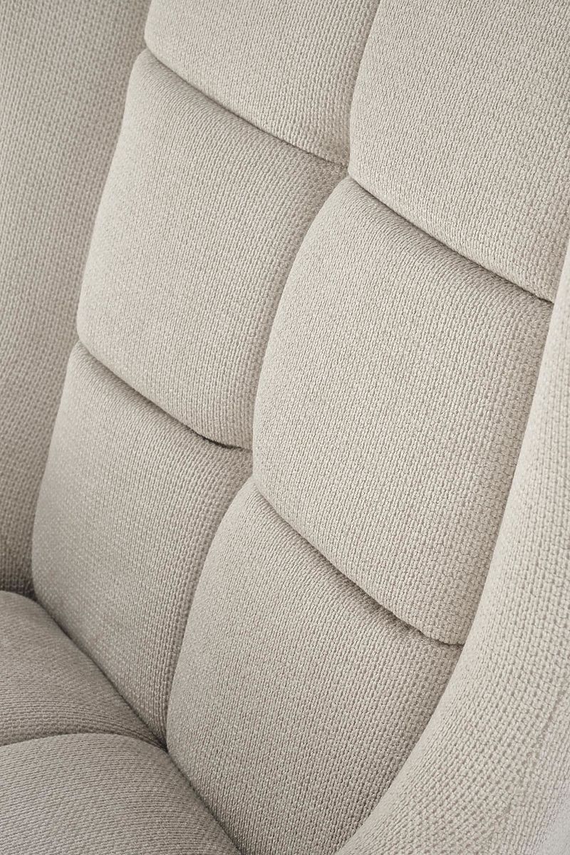 Křeslo je navrženo s důrazem na maximální komfort při sezení, ať už při odpočinku, četbě nebo sledování televize. Sedací i opěrná část je čalouněná příjemnou prošívanou látkou v elegantním olivovém odstínu, která působí útulně a stylově.