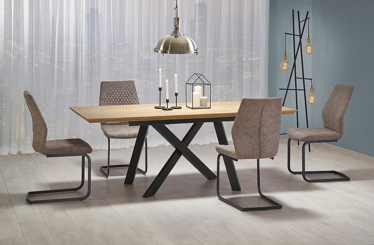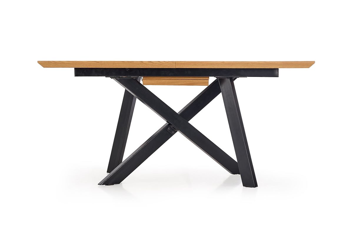 Jídelní rozkládací stůl CAPITAL 160–200 cm zaujme moderním designem a praktickou rozkládací funkcí, která umožňuje pohodlné stolování pro rodinu i hosty. Obdélníková deska ve zlatém dubu v kombinaci s černou kovovou podstavou vytváří elegantní a nadčasový kontrast vhodný do moderních jídelních, obývacích i kuchyňských prostor.