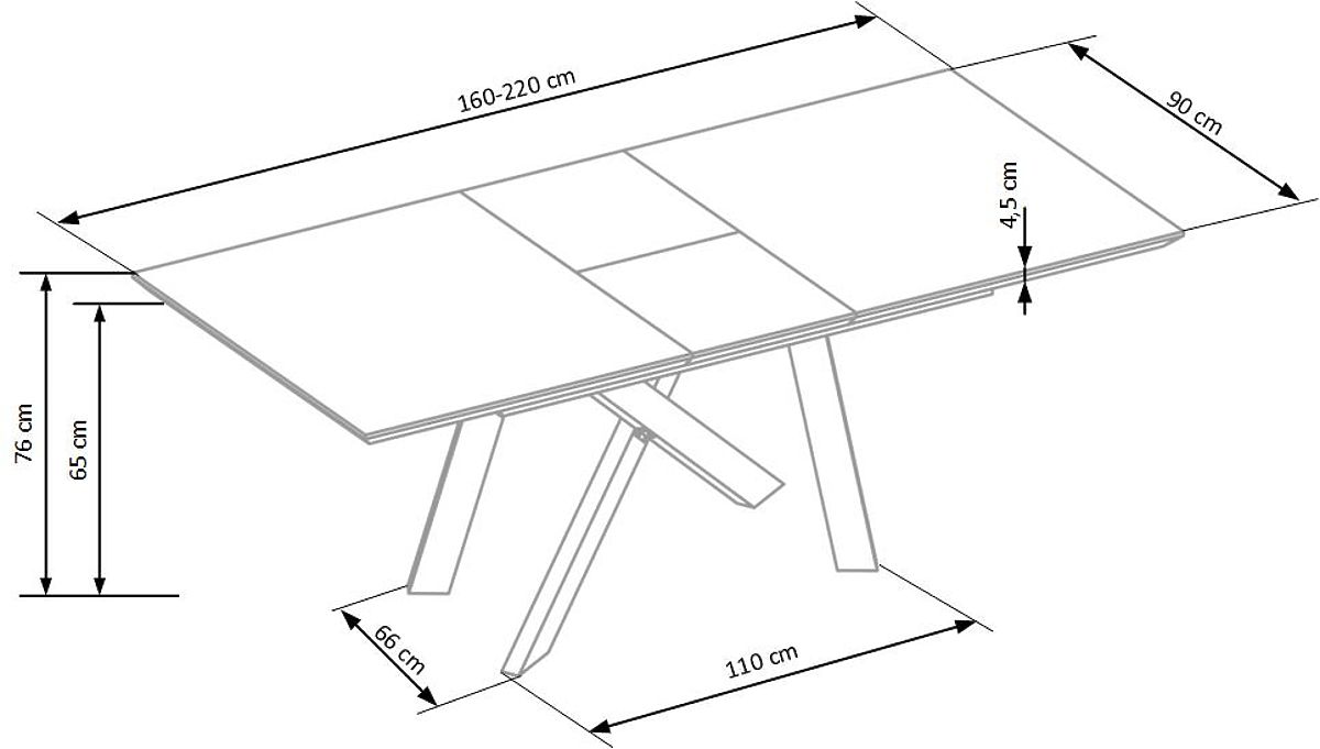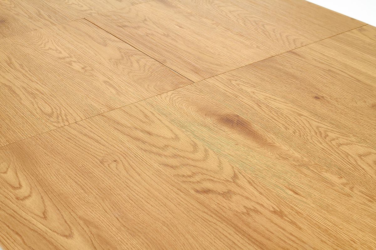 Stůl lze rozložit z 160 cm na 200 cm, přičemž rozkládací vložka je vždy po ruce. Povrchová úprava z MDF s přírodní dýhou je odolná a snadno udržovatelná, doporučuje se však po vylití tekutin desku ihned otřít do sucha, aby nedošlo k absorpci vody. Stabilní podnož z práškově lakované oceli zajišťuje pevnost a dlouhou životnost stolu.