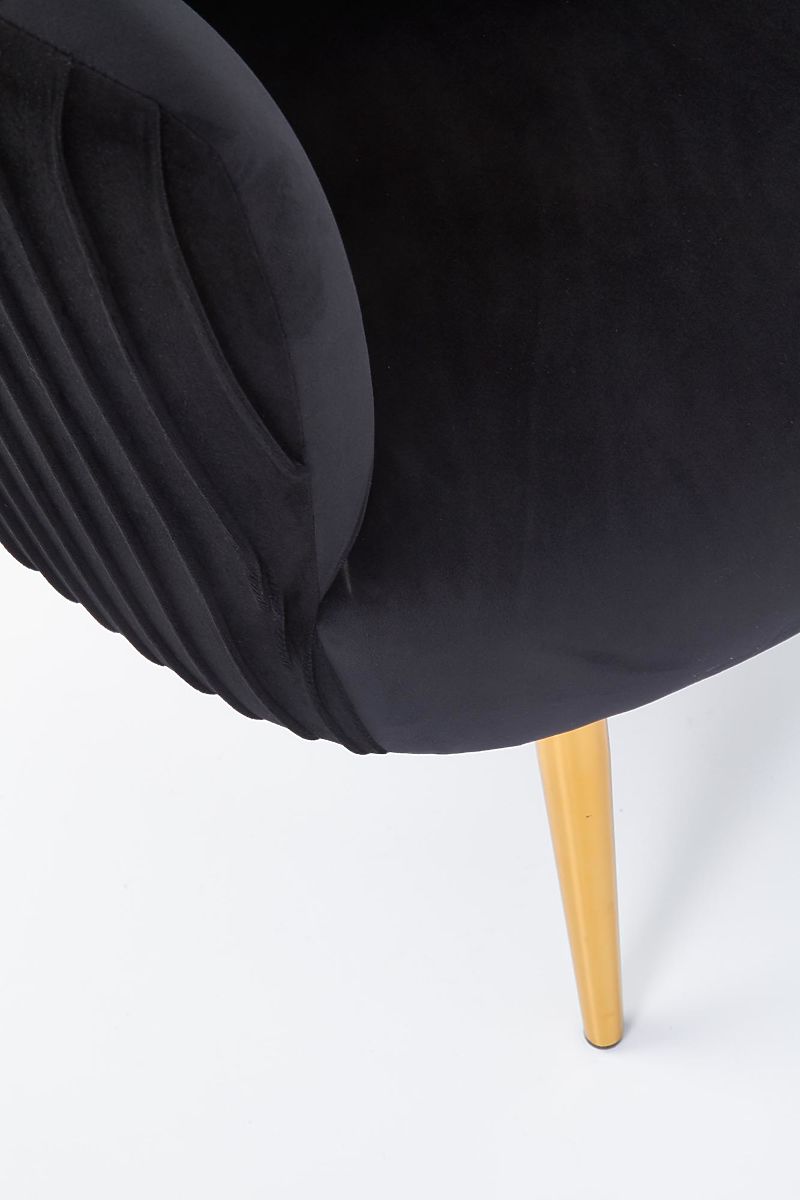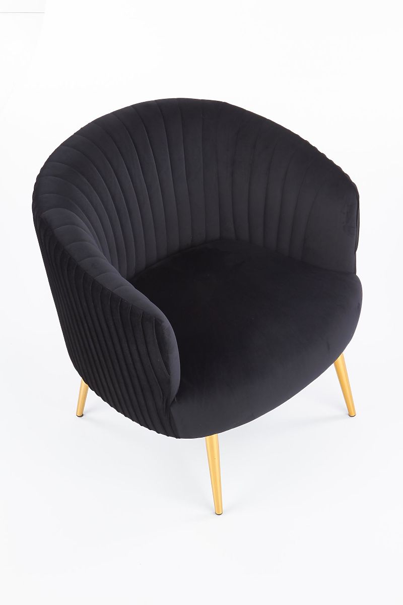 Relaxační křeslo s černým čalouněním a zlatými nohami. .. více