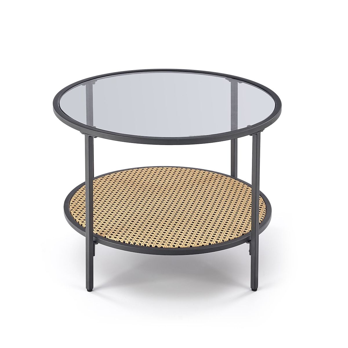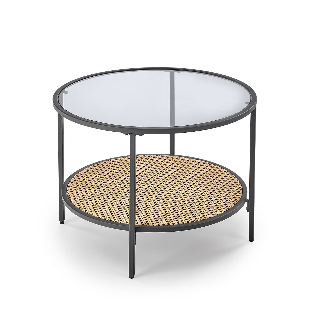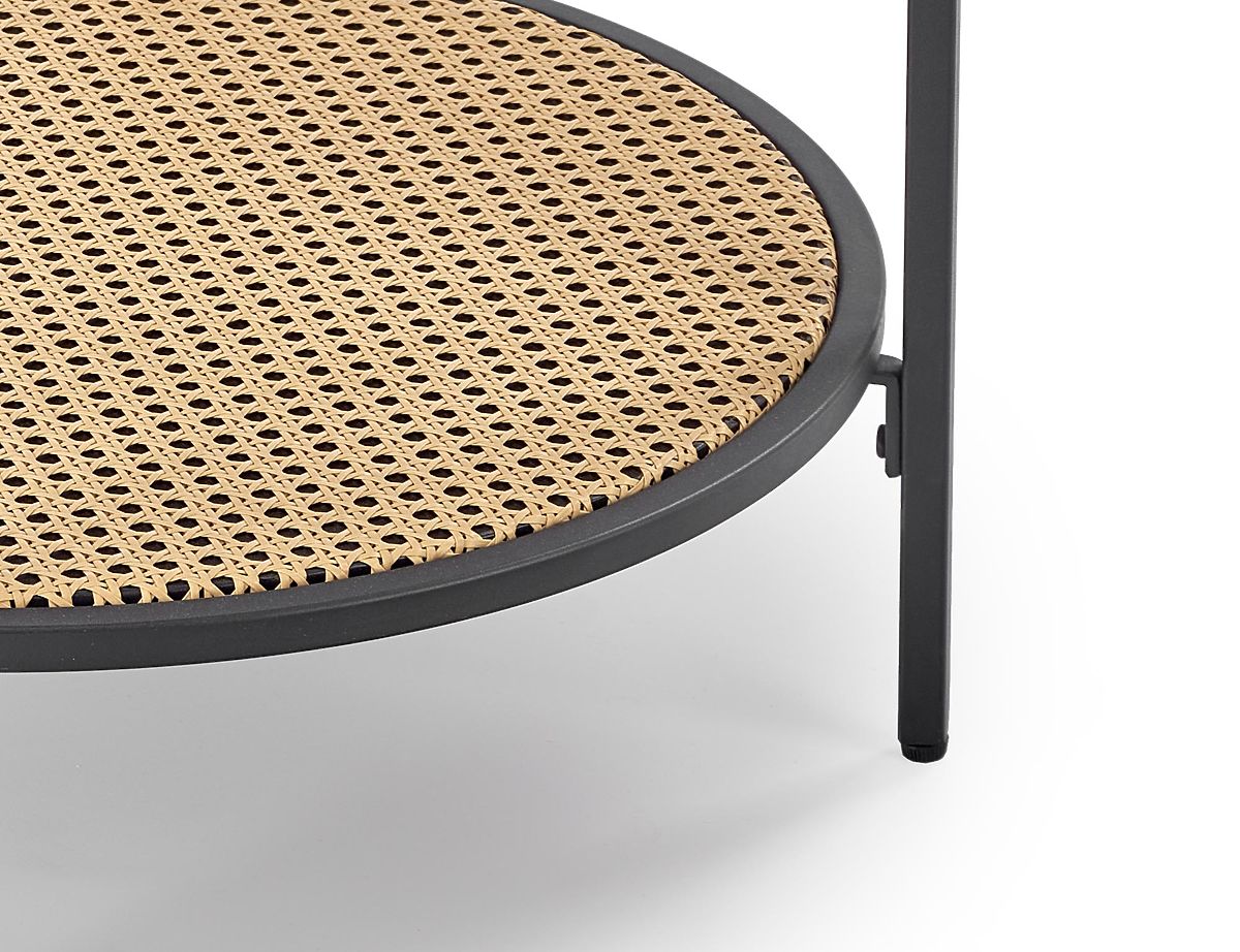 Kulatá deska stolku poskytuje dostatek prostoru pro odložení nápojů, dekorací nebo knih, zatímco ratanový prvek dodává nábytku příjemný přírodní charakter. Stabilní ocelová konstrukce zajišťuje pevnost a dlouhou životnost při každodenním používání.