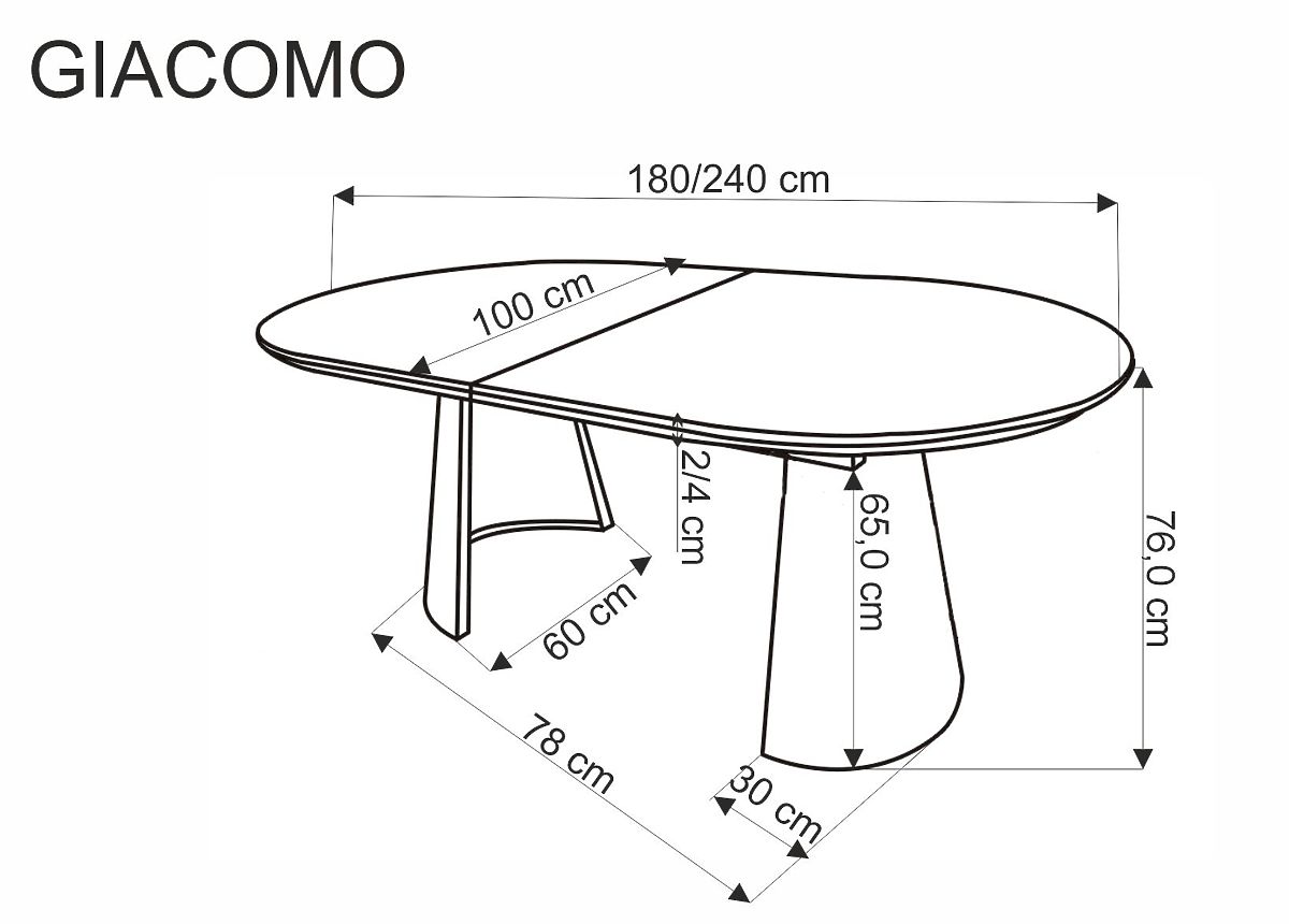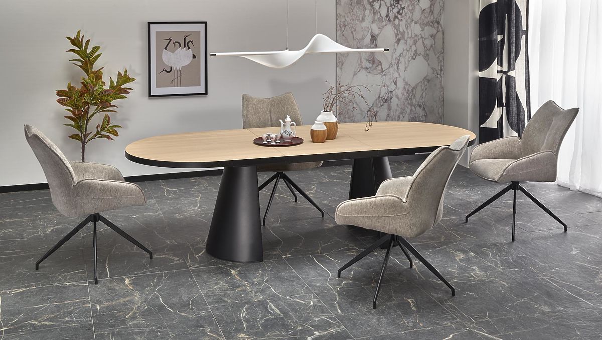 Rozkládací stůl GIACOMO je praktický a elegantní kus nábytku vhodný do jídelny i denní zóny. Díky oválnému tvaru podporuje pohodlnou komunikaci u stolu a umožňuje snadný pohyb kolem něj. Rozkládací funkce zajišťuje flexibilitu při každodenním používání i při větších rodinných setkáních.