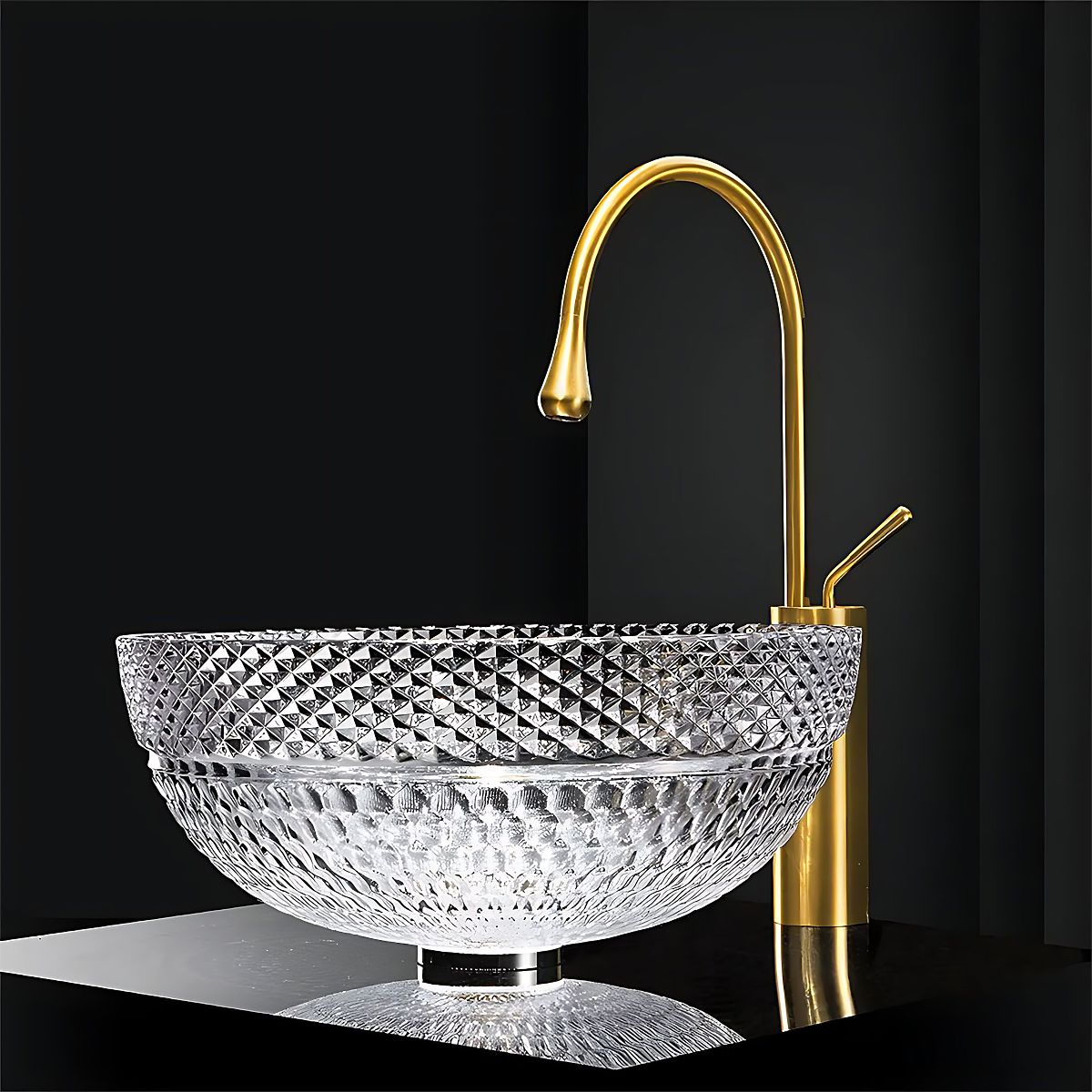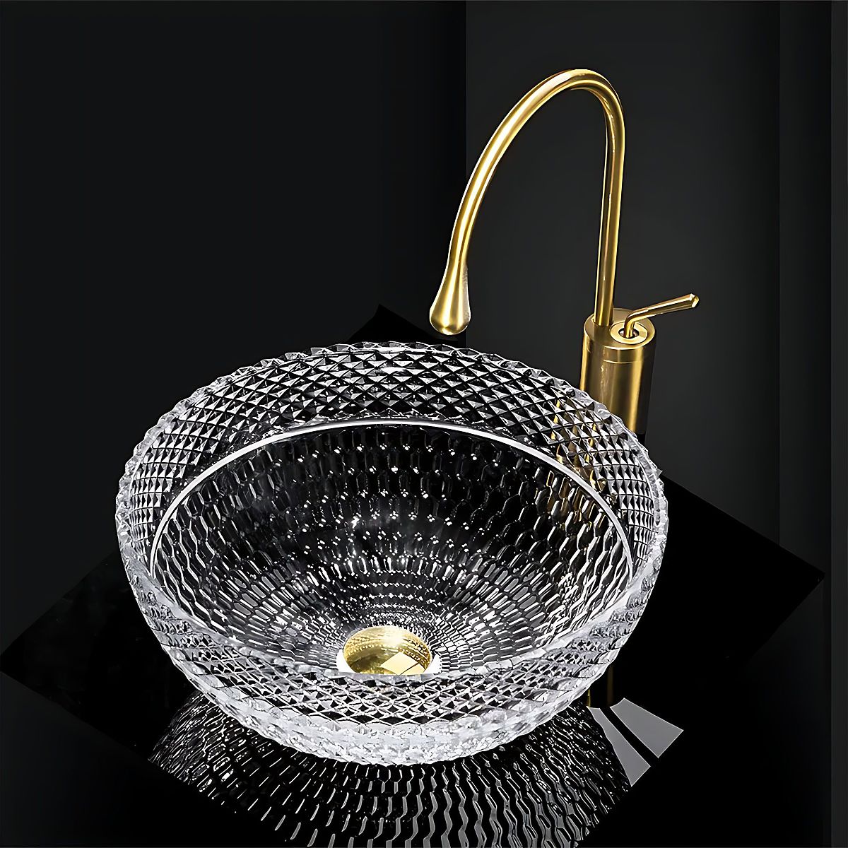 Křišťálové nadčasové umyvadlo Sue je výjimečným prvkem vybavení koupelny, který spojuje eleganci a funkčnost. Vyrobeno z vysoce kvalitního tvrzeného skla, zaujme precizně zdobeným povrchem s efektním diamantovým vzorem, který krásně odráží světlo a dodává interiéru luxusní charakter. Díky své konstrukci je přizpůsobeno pro montáž na desku nebo skříňku, což umožňuje volné přizpůsobení různorodým aranžmá. Je to skvělá volba pro ty, kteří chtějí dodat své koupelně výjimečný styl a eleganci.