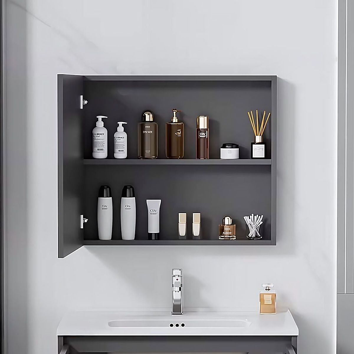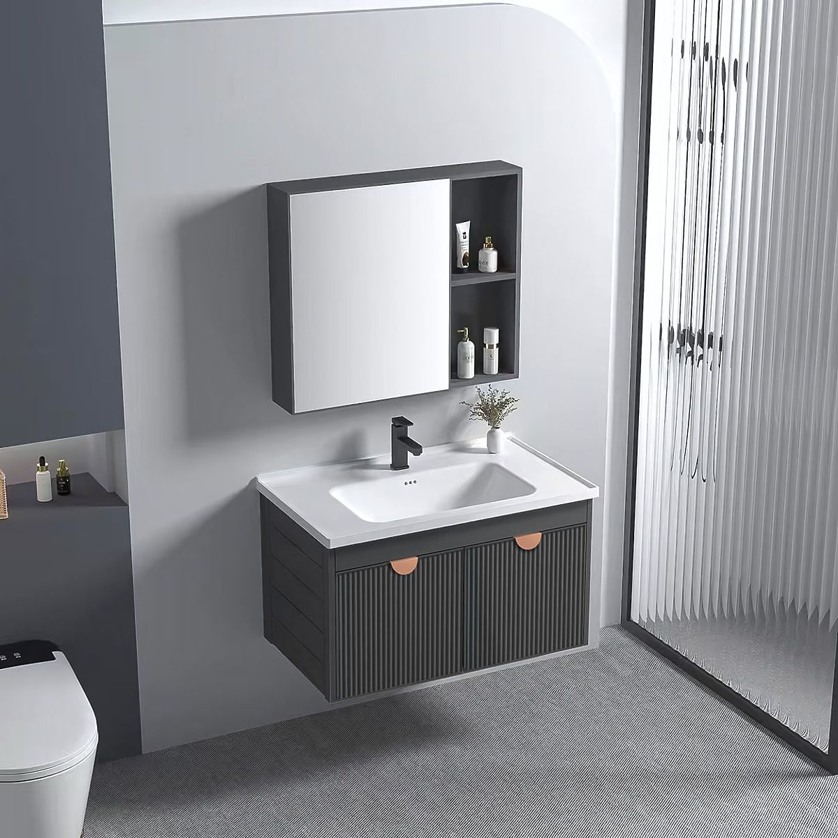 Moderní koupelnová sada Mario – skříňka s umyvadlem + skříňka se zrcadlem Sada koupelnového nábytku Mario je návrh, který kombinuje stylový vzhled s každodenní funkčností. Skvěle se hodí do moderních koupelen, kde záleží na pohodlí a promyšlené organizaci prostoru. Souprava sestávající z závěsné skříňky pod umyvadlo a skříňky se zrcadlem je hotové řešení, které umožňuje vytvořit praktickou a jednotnou umyvadlovou zónu bez nutnosti hledání samostatných prvků. h4. Minimalistická forma, která se hodí všude Model Mario se vyznačuje charakteristickými, vertikálně drážkovanými čely, které dodávají celku moderní a dynamický vzhled. K dispozici jsou dvě barevné varianty – grafitová a bílá, obě doplněné o elegantní úchyt v měděné barvě. Díky tomu se sada skvěle hodí k módním aranžmá, jak v tlumené, tak i výraznější verzi. h4. Praktická řešení pro každodenní použití Skříňka se zrcadlem je vybavena otevřenými policemi, které zajišťují rychlý přístup k denní kosmetice. Dolní skříňka pojme větší předměty, jako jsou čisticí prostředky nebo kosmetika v lahvích. Celek je montován na stěnu, což nejen opticky zvětšuje prostor, ale také usnadňuje udržování čistoty kolem nábytku. h4. Umyvadlo přizpůsobené celku Součástí je keramické umyvadlo s otvorem pro baterii, přizpůsobené velikostí dolní skříňce. Jeho univerzální forma dobře ladí se zbytkem sady, tvořící jednotný a estetický celek. Mario je sada, která nabízí jednotný vzhled a praktická řešení – připravena k montáži a okamžitému použití v každé moderní koupelně.