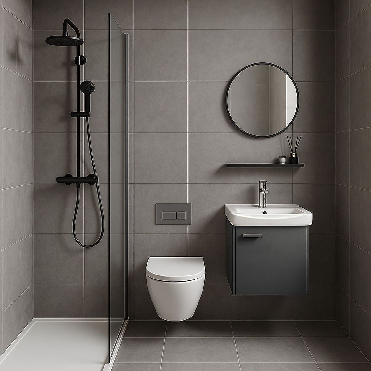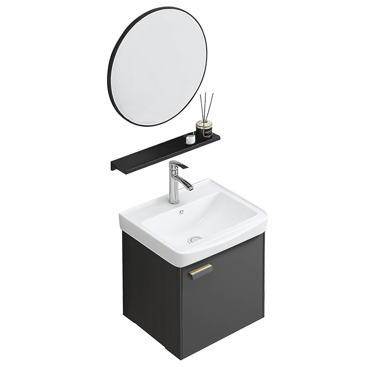 Moderní koupelnová sada Molly – skříňka s umyvadlem + zrcadlo + police Sada koupelnového nábytku Molly je praktickým a stylovým řešením pro moderní koupelny, kde záleží na funkčnosti a lehkém, minimalistickém designu. Souprava se skládá z nástěnné skříňky s umyvadlem, kulatého zrcadla a police, což vytváří jednotnou umyvadlovou zónu ideální pro každodenní použití. Je to pohodlné řešení pro koupelny různých velikostí – jak malé, tak střední. h4. Jednoduchý design, který se hodí do každého uspořádání Model Molly se vyznačuje hladkým, jednolitým povrchem čela a geometrickým tvarem, který vypadá dobře v každém uspořádání. Dostupné barevné varianty – bílá a grafitová – umožňují přizpůsobit sadu různým stylům interiéru: od moderních po klasičtější. Celkový vzhled doplňuje kontrastní úchyt a kulaté zrcadlo, které přidává interiéru optickou lehkost. h4. Funkčnost uzavřená v jednoduchosti Přiložená police umožňuje pohodlně uspořádat nejpotřebnější kosmetiku, díky čemuž získáte více úložného prostoru bez zastavění stěny. Spodní skříňka pojme věci denní potřeby a nástěnná montáž zajišťuje, že celek vypadá moderně a ponechává volný prostor pod nábytkem – což výrazně usnadňuje úklid. h4. Umyvadlo přizpůsobené celku Součástí sady je keramické umyvadlo s otvorem pro baterii, dokonale přizpůsobené spodní skříňce. Jeho neutrální tvar zajišťuje pohodlné používání a estetické sladění s ostatními prvky. Sada Molly je kompletní, připravená k montáži, a skvěle se hodí do koupelen zařízených s ohledem na jednoduchost a praktické využití prostoru.