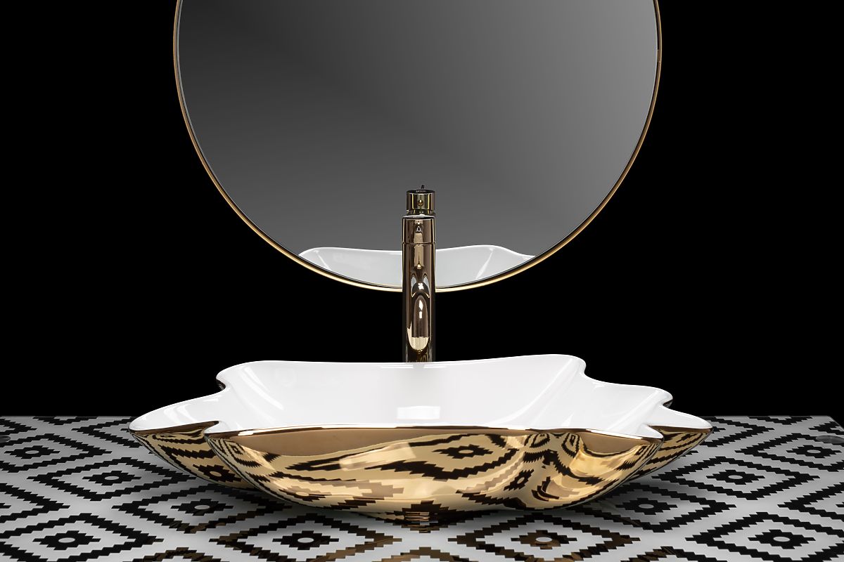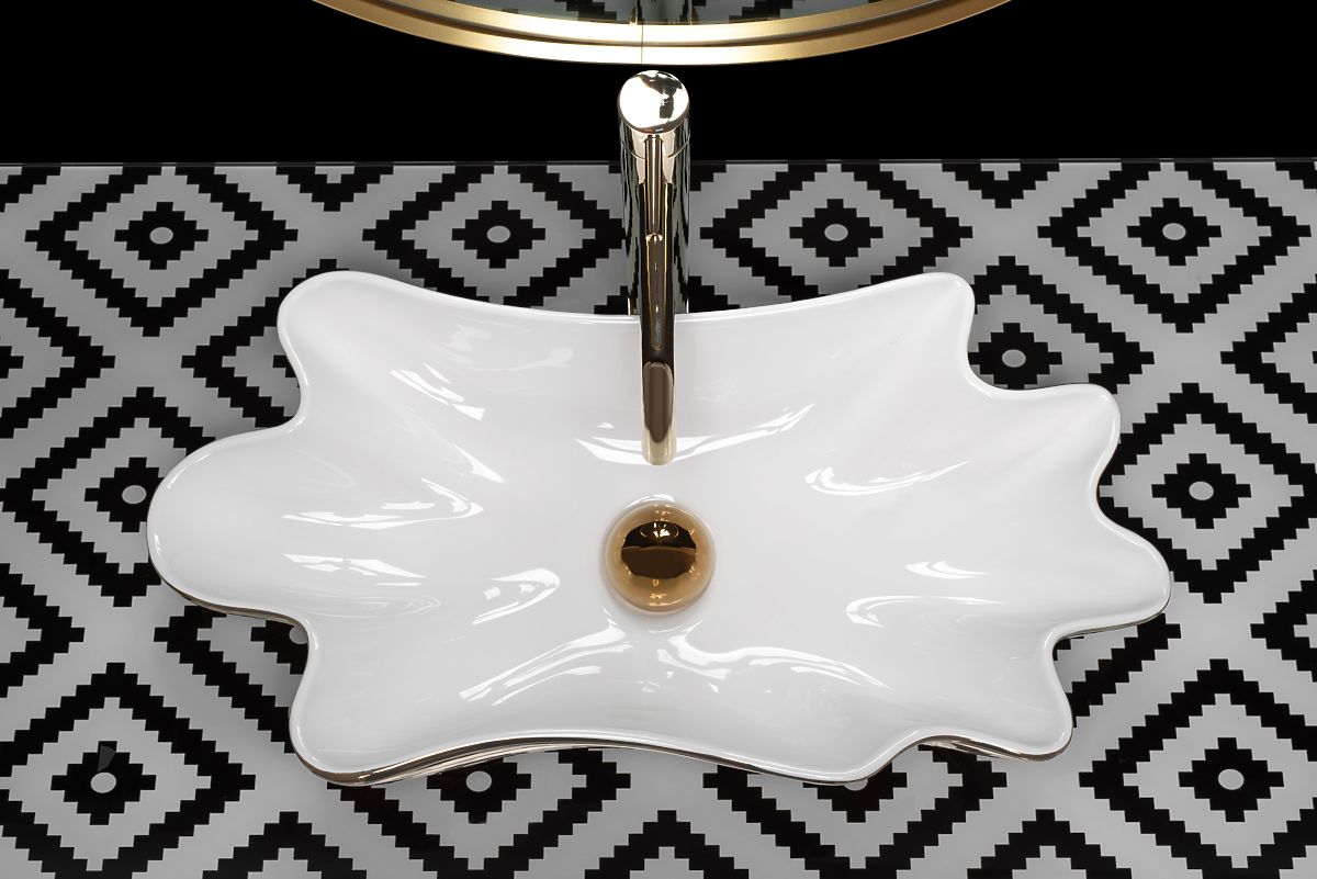 Umyvadlo vyrobené z nejkvalitnější keramiky v bílé barvě a oválném, zvlněném tvaru. Umyvadlo je zakončeno zlatým okrajem, což dodává krásný konečný efekt. Umyvadlo je neuvěřitelně atraktivní na pohled, je ideální pro milovníky nestandardních tvarů, přináší eleganci do uspořádání koupelny doma i v kanceláři.