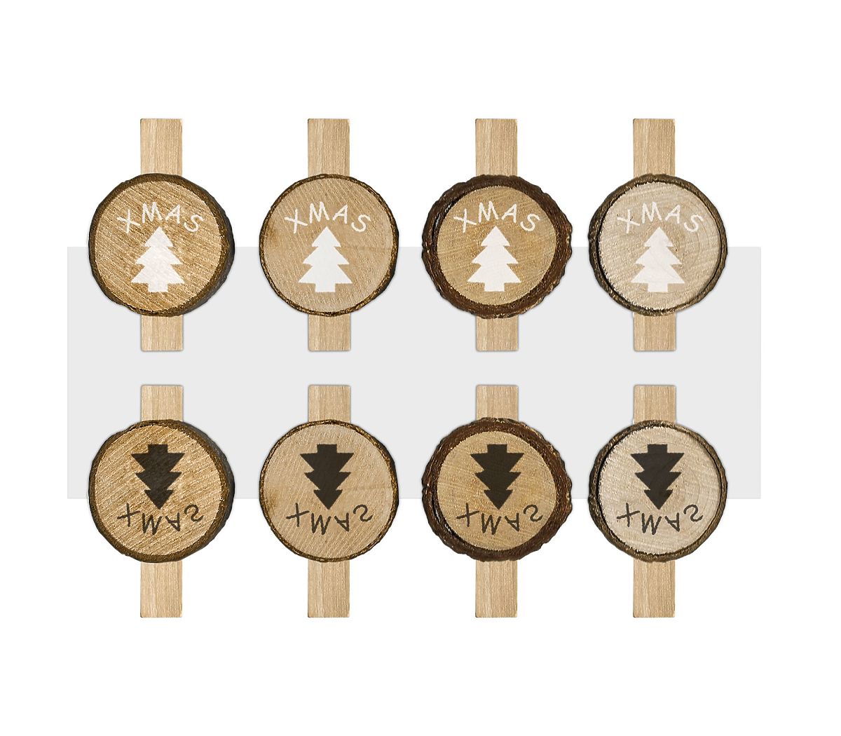 Sada osmi dřevěných kolíčků s motivem stromečku a nápisem XMAS je drobný detail, který dokáže zcela změnit charakter vánočních dekorací. Přírodní dřevo v kombinaci s rustikálním provedením vytváří ozdobu plnou tepla a útulnosti, která dokonale zapadá do atmosféry Vánoc. Kolíčky mají délku 5 cm a byly vyrobeny s důrazem na každý detail, díky čemuž je lze opakovaně používat v dalších sezónách.