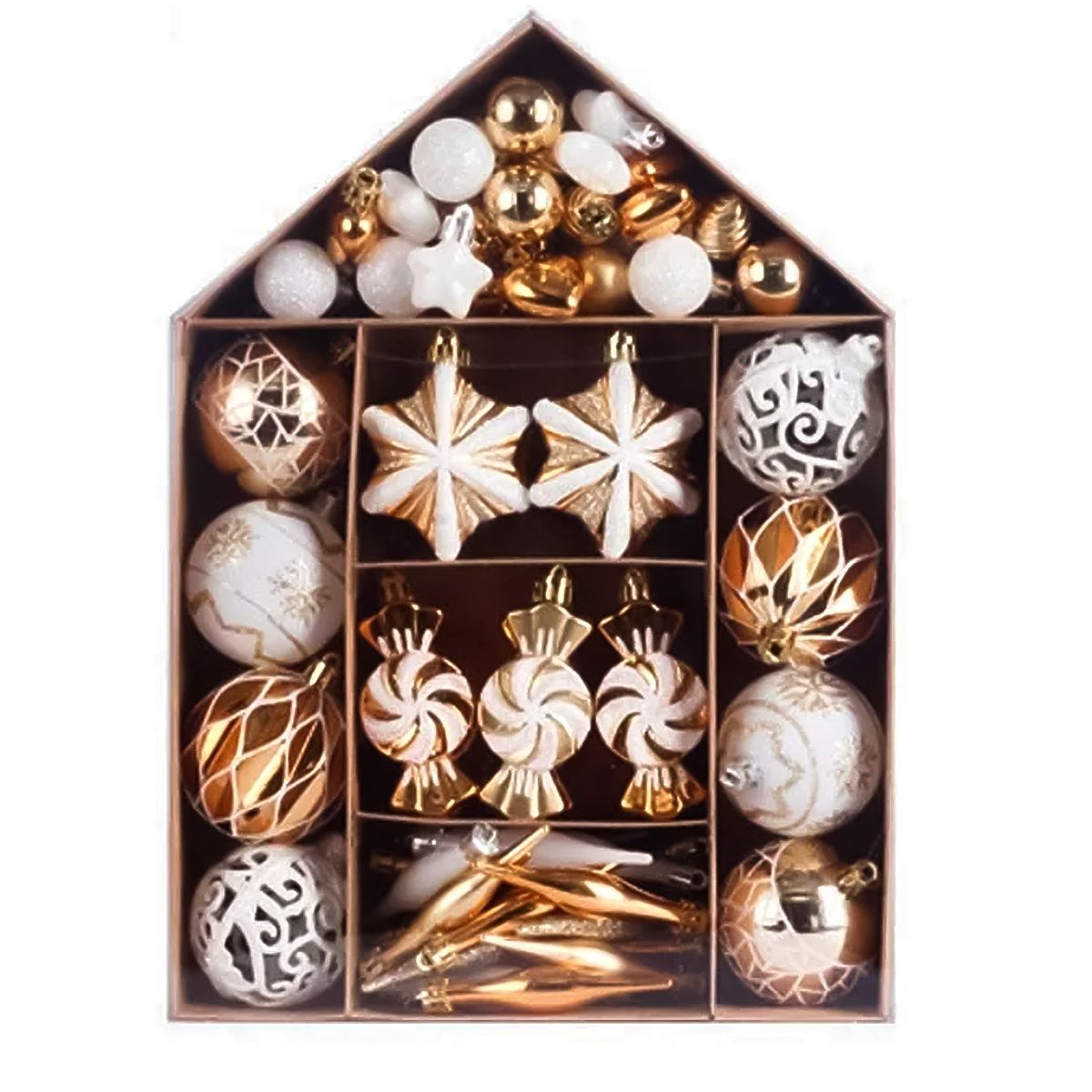 Sada obsahuje 17 různých druhů ozdob. Sada je složena z prvků o velikosti od 3,5 cm do 9 cm. Dekorace mají různou strukturu a povrchovou úpravu, díky čemuž obohatí vzhled vánočního stromku.