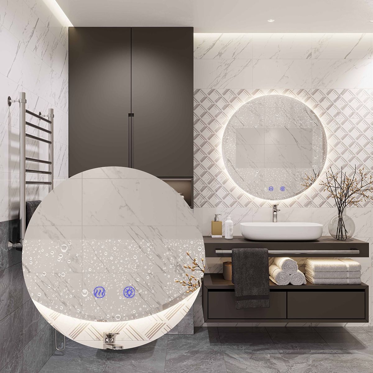 Kulaté zrcadlo s LED osvětlením je ideální volbou pro ty, kteří si cení pohodlí při používání a moderního designu. Zrcadlo je vyrobeno z nejkvalitnějších materiálů, skvěle se prezentuje a je velmi odolné. Nabízí tři dotykově měnitelné barvy LED světla – teplou, neutrální a studenou, a funkci ohřevu, která zabraňuje zamlžování povrchu. Dotykový přepínač umístěný v ploše zrcadla je podsvícen modře při aktivaci funkce. Napájecí kabel bílé barvy o délce 110 cm.