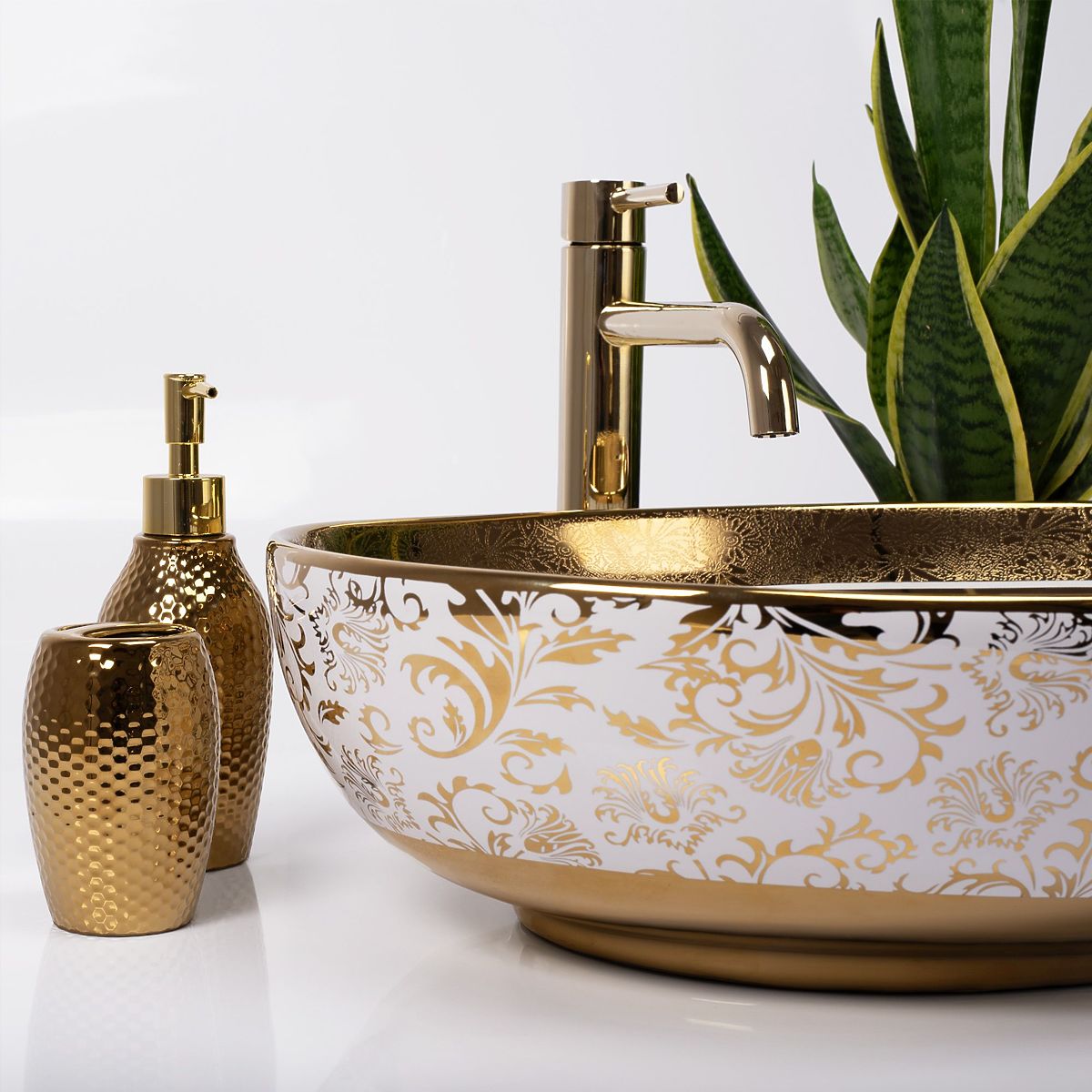 Jedná se o produkt, který skvěle doplní vaši koupelnovou prostor a zachová bezchybný vzhled a estetiku interiéru. Mísa je pokryta krásnou zlatou barvou s rostlinným motivem, který kontrastuje s bílou barvou.