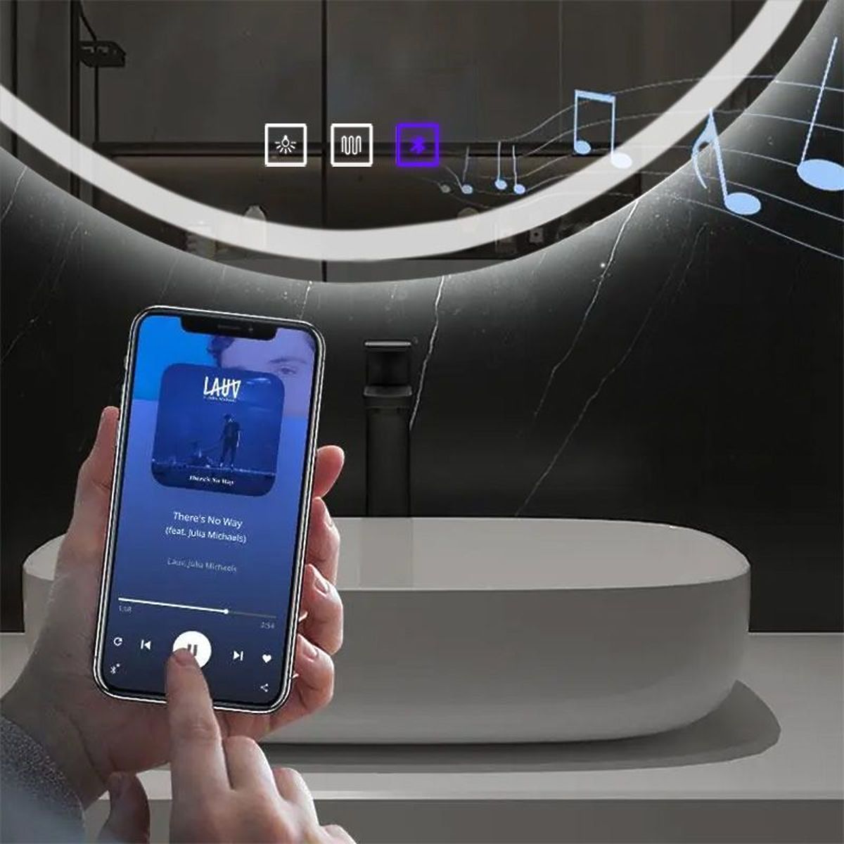 Zrcadlo navíc disponuje funkcí Bluetooth a vestavěnými reproduktory. Stačí se připojit k zrcadlu pomocí smartphonu nebo tabletu a užívat si své oblíbené skladby nebo podcasty.