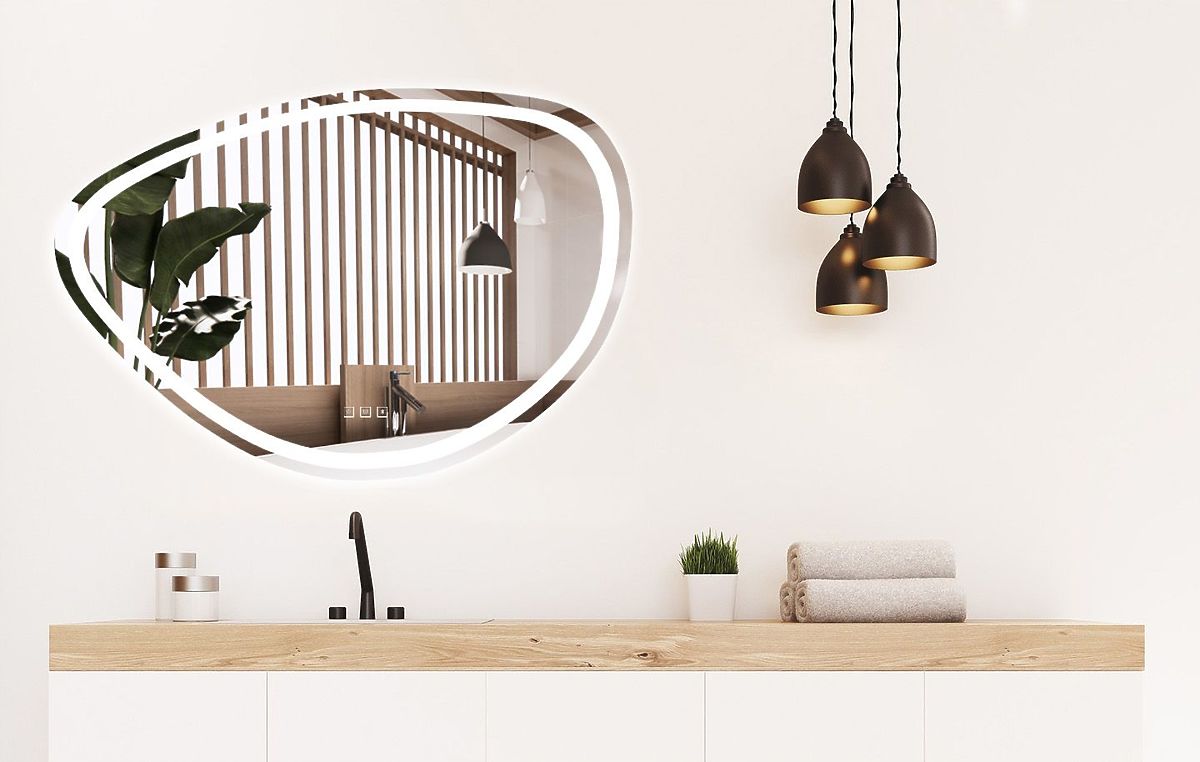 Asymetrické zrcadlo s LED podsvícením je ideální volbou pro ty, kteří si cení pohodlí při používání a moderního designu. Zrcadlo je vyrobeno z nejkvalitnějších materiálů, skvěle se prezentuje a je velmi odolné. Nabízí tři dotykově měnitelné barvy LED světla – teplou, neutrální a studenou, a funkci ohřevu, která zabraňuje zamlžení povrchu. Napájecí kabel v bílé barvě má délku 110 cm.