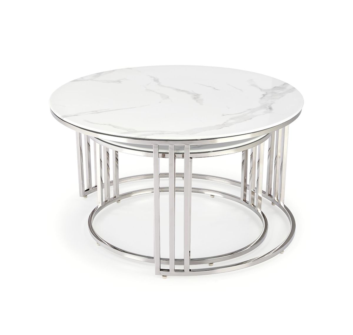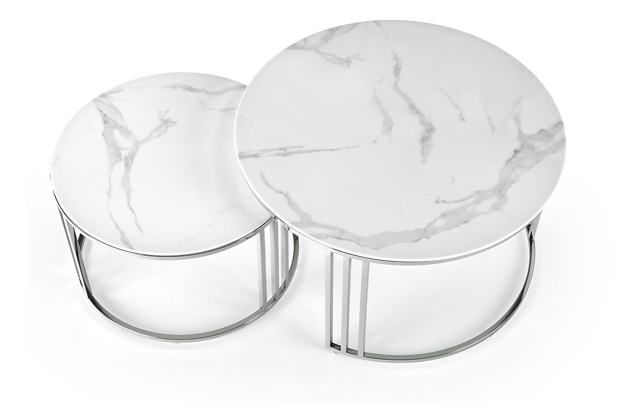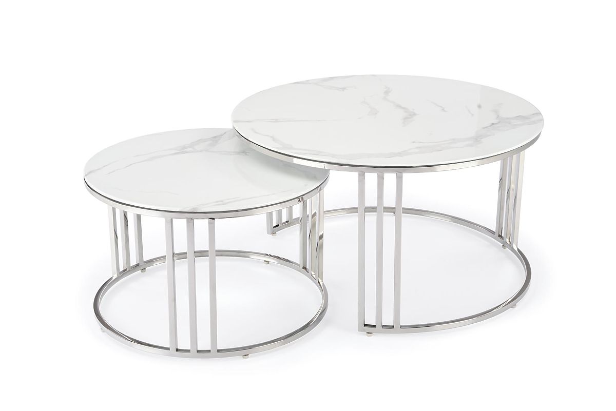 Lukafurniture.cz » Stoly a stolky / Konferenční stolky / MERCURY 2 sada 2 lavic, rám - stříbrný, sklo - bílý mramor