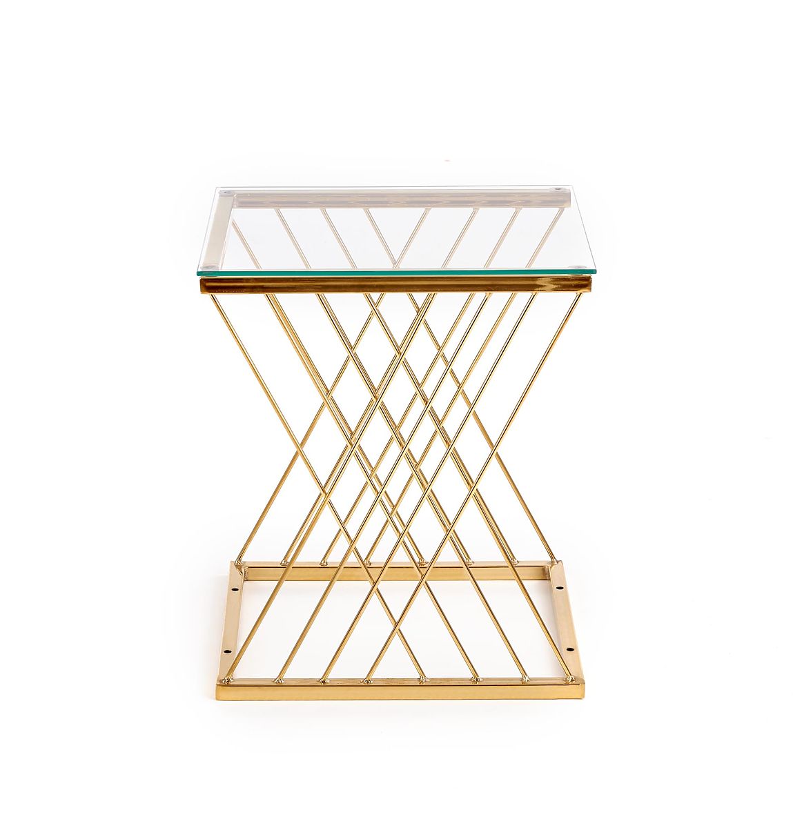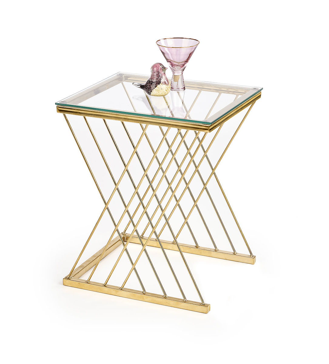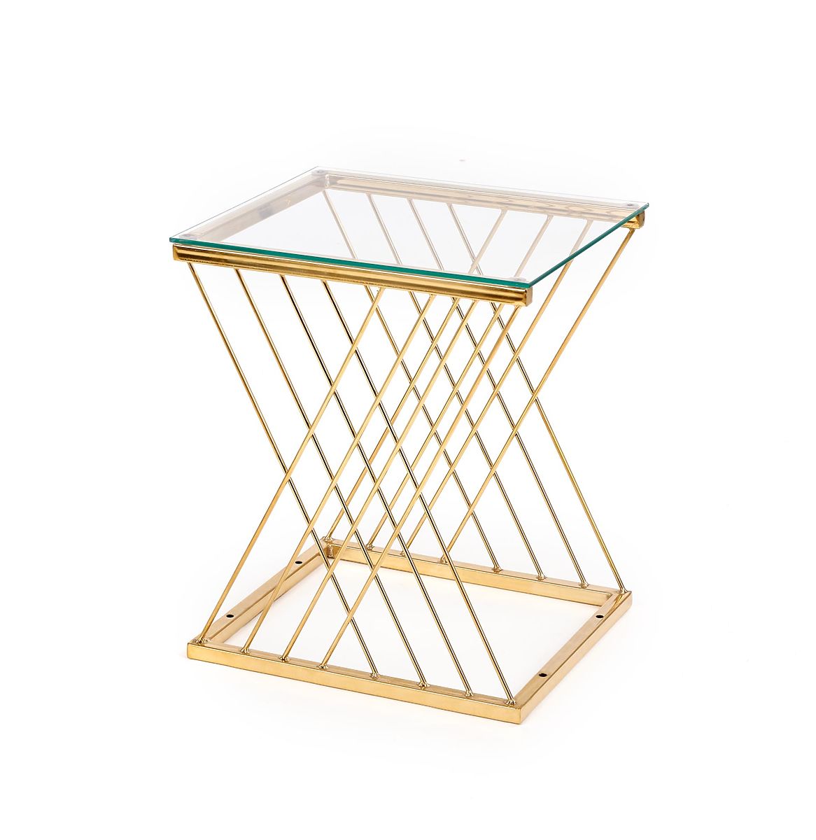 Originálně tvarovaný podstavec v kombinaci s průhlednou skleněnou deskou dodává stolku lehký a elegantní vzhled, který zaujme na první pohled. Spojení chromované oceli ve zlatém provedení a skla vytváří luxusní dojem a krásně doplní moderní i glamour interiéry.