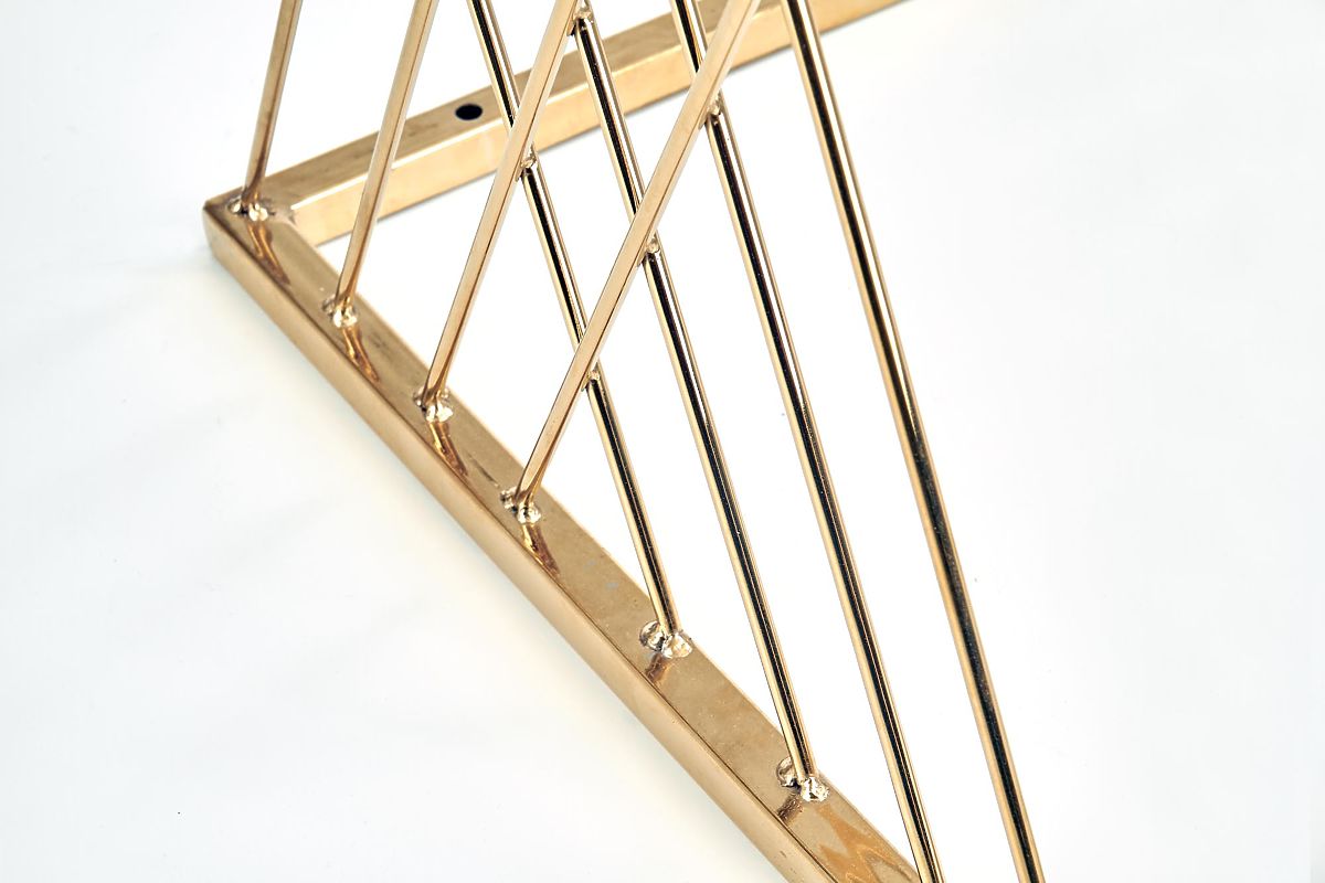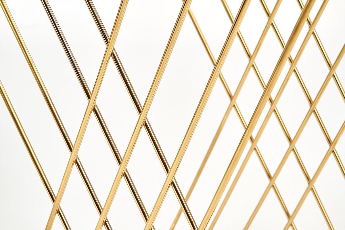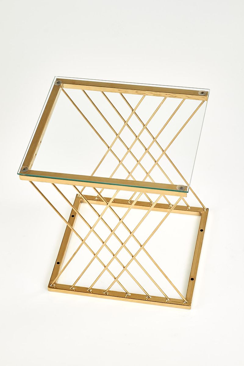 Originálně tvarovaný podstavec v kombinaci s průhlednou skleněnou deskou dodává stolku lehký a elegantní vzhled, který zaujme na první pohled. Spojení chromované oceli ve zlatém provedení a skla vytváří luxusní dojem a krásně doplní moderní i glamour interiéry.