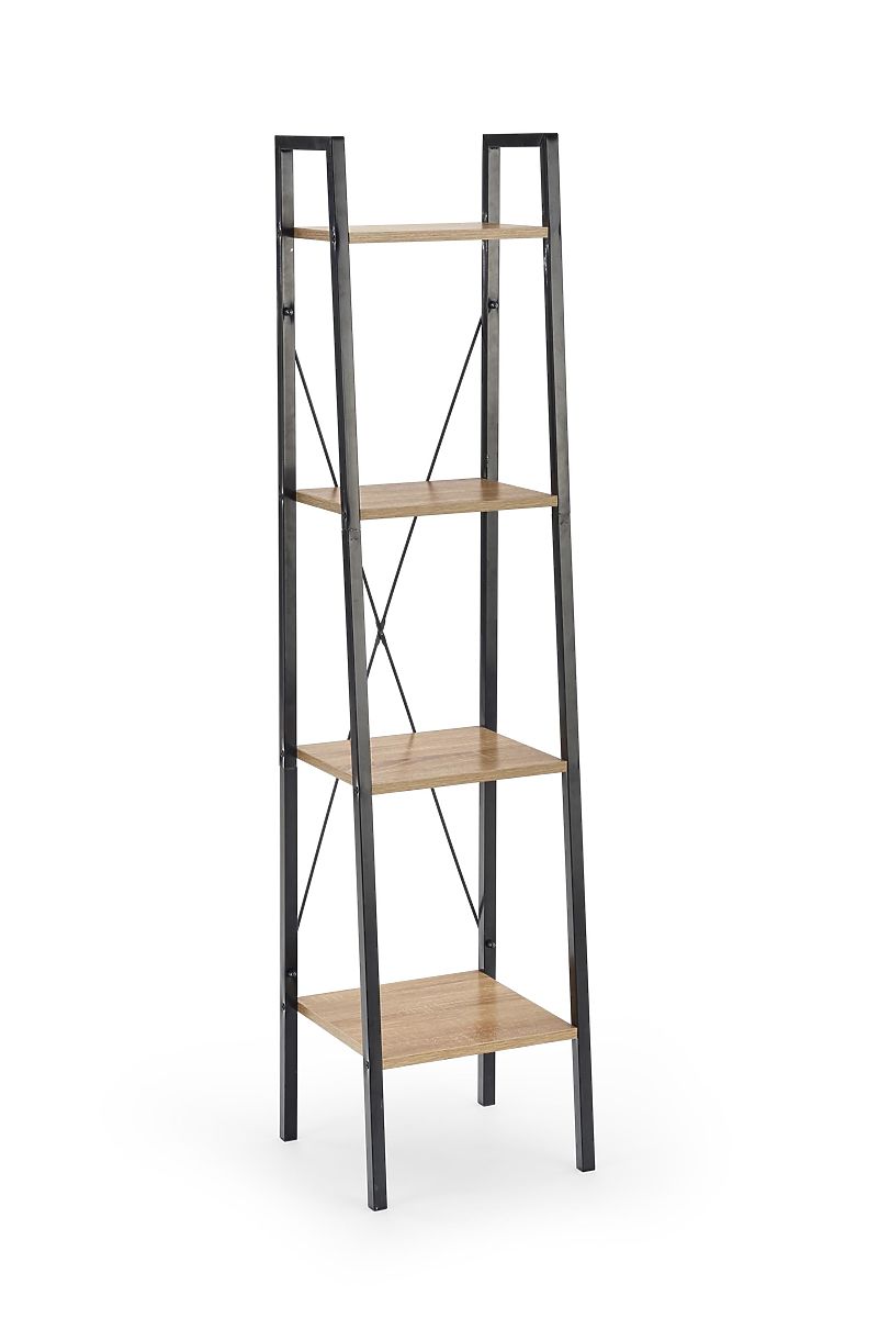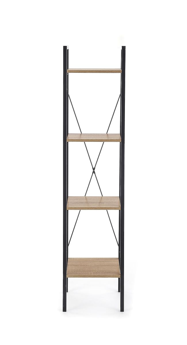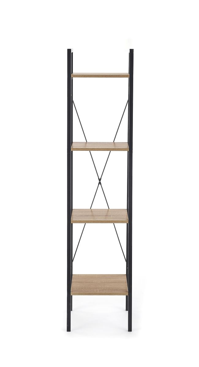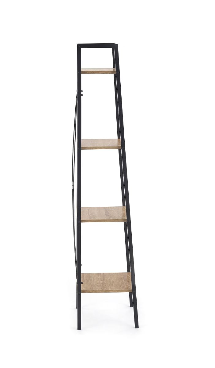 Regál je tvořen čtyřmi otevřenými policemi, které poskytují přehledný úložný prostor pro knihy, dekorace nebo doplňky. Police z laminované dřevotřísky v dekoru dub sonoma jsou doplněny pevnou konstrukcí z práškově lakované oceli v černé barvě, která zajišťuje stabilitu a podtrhuje industriální vzhled.