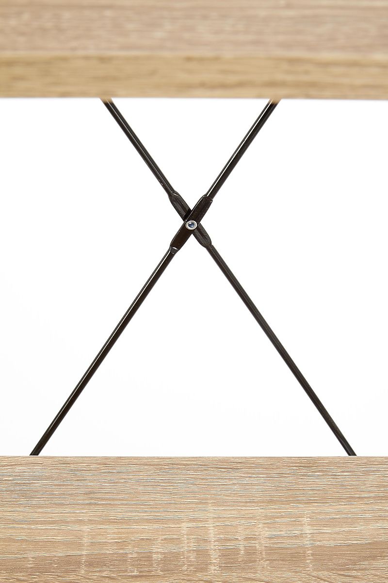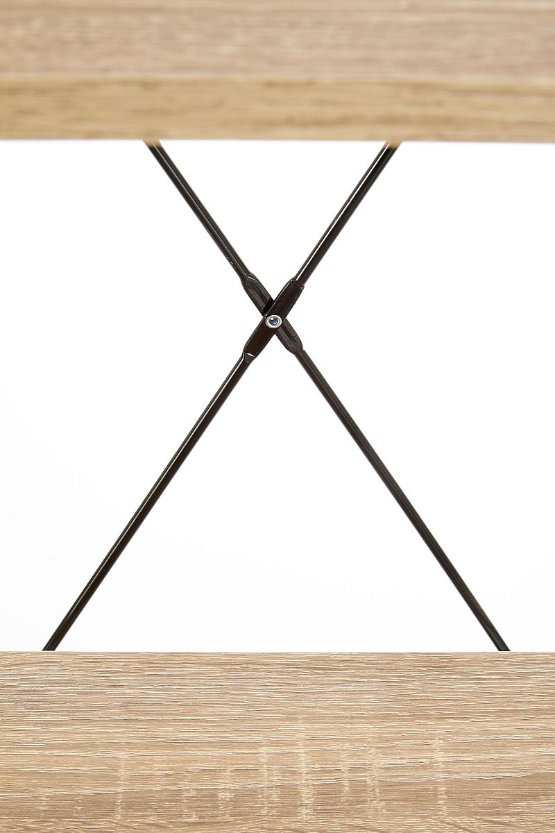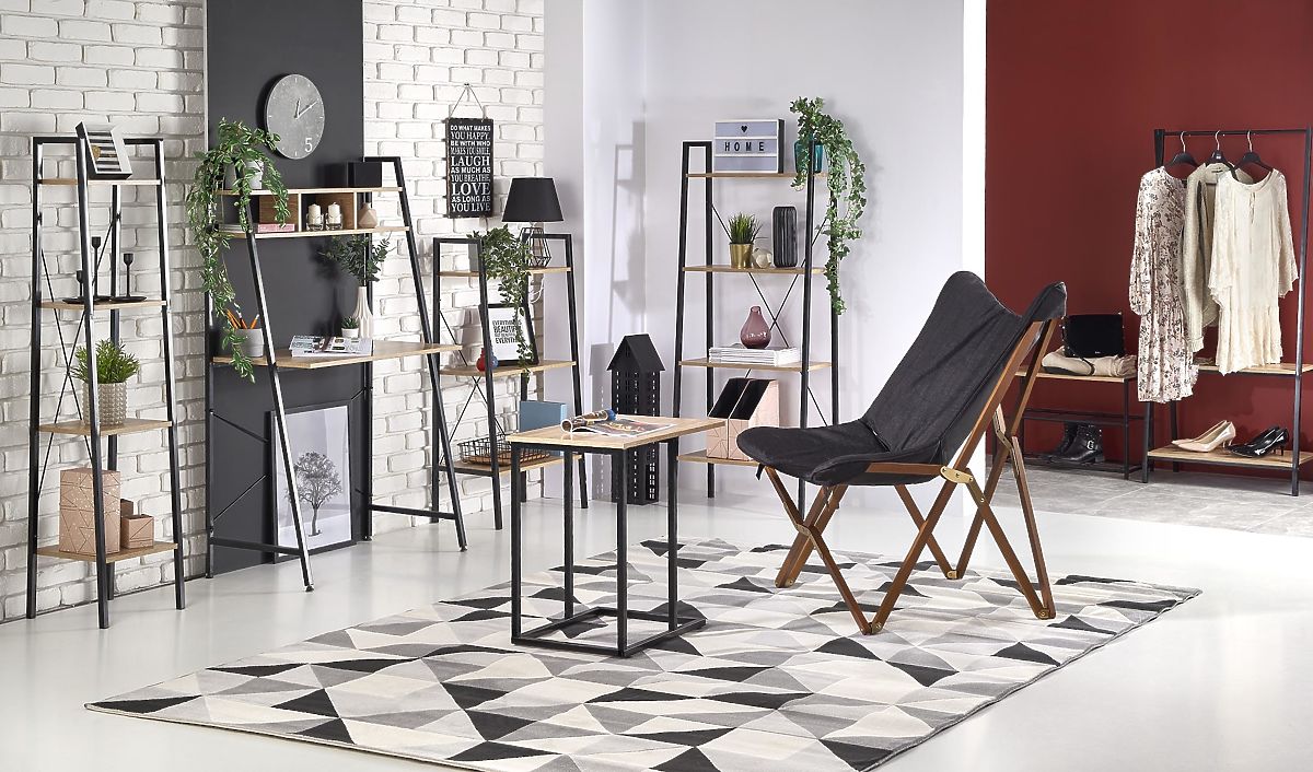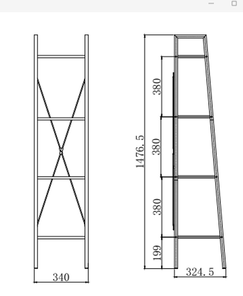 Regál je tvořen čtyřmi otevřenými policemi, které poskytují přehledný úložný prostor pro knihy, dekorace nebo doplňky. Police z laminované dřevotřísky v dekoru dub sonoma jsou doplněny pevnou konstrukcí z práškově lakované oceli v černé barvě, která zajišťuje stabilitu a podtrhuje industriální vzhled.