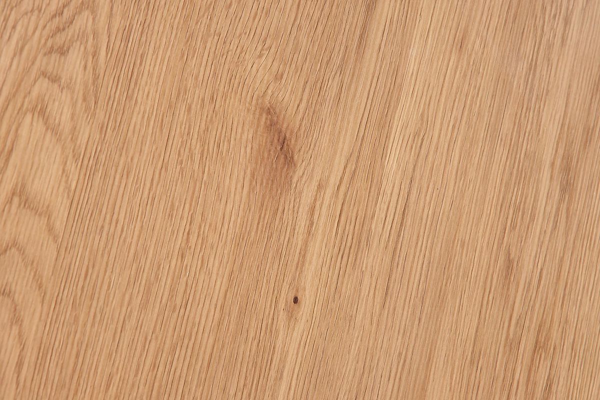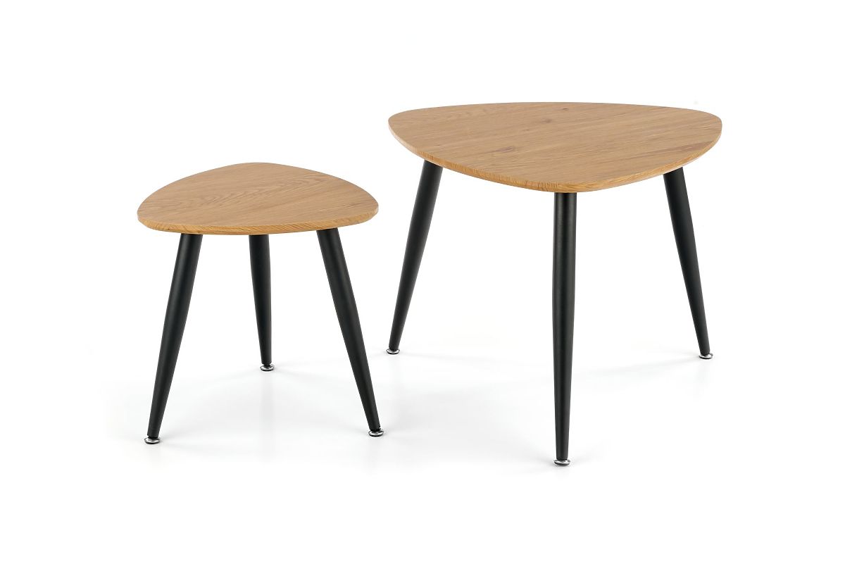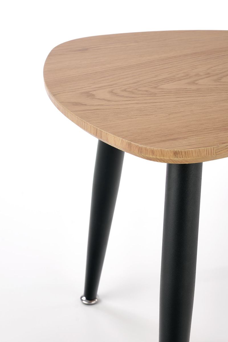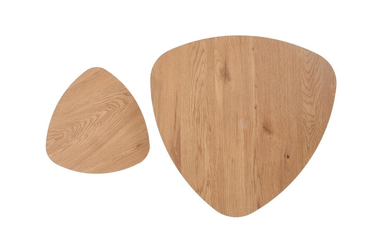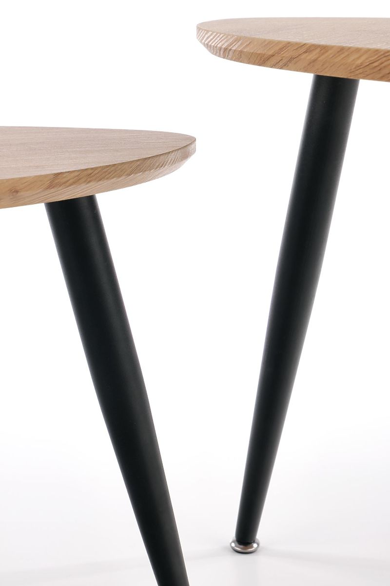 Stabilitu zajišťují tři ocelové nohy s černým práškovým nástřikem, které se směrem dolů jemně zužují a dodávají stolům lehký a moderní vzhled. Oválné desky z dýhované MDF s viditelnou přírodní kresbou podtrhují nadčasový charakter celé sestavy.