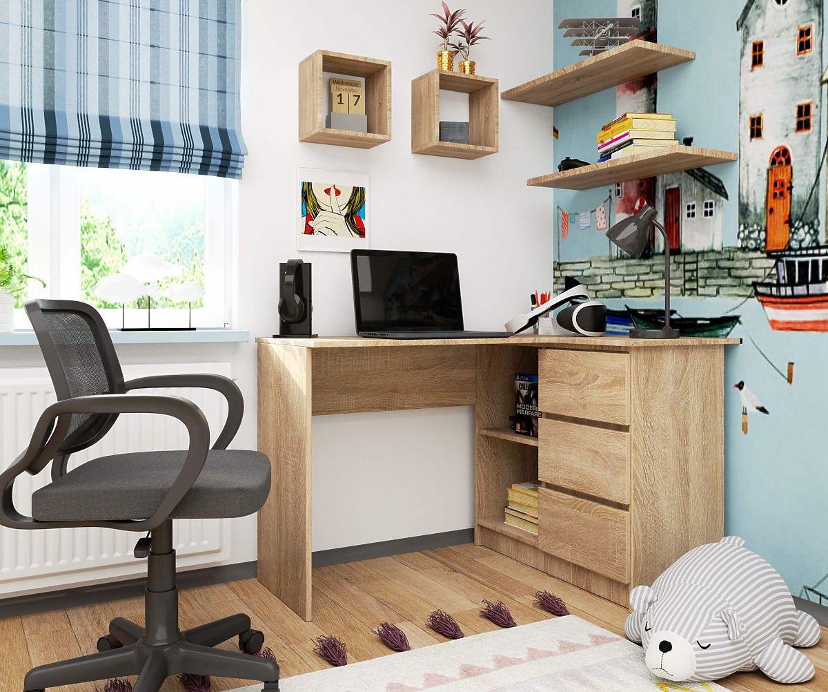 Představovaný model je: Rohový psací stůl 3 zásuvky B16 pravý dub sonoma