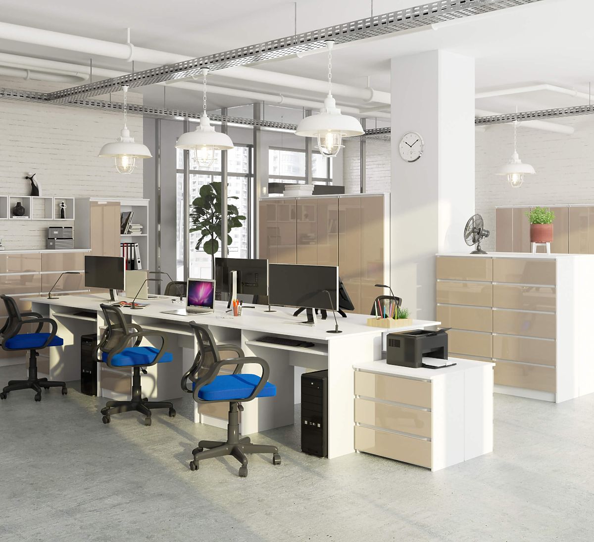 Psací stůl s bílým korpusem a lesklými cappuccino čely. .. více