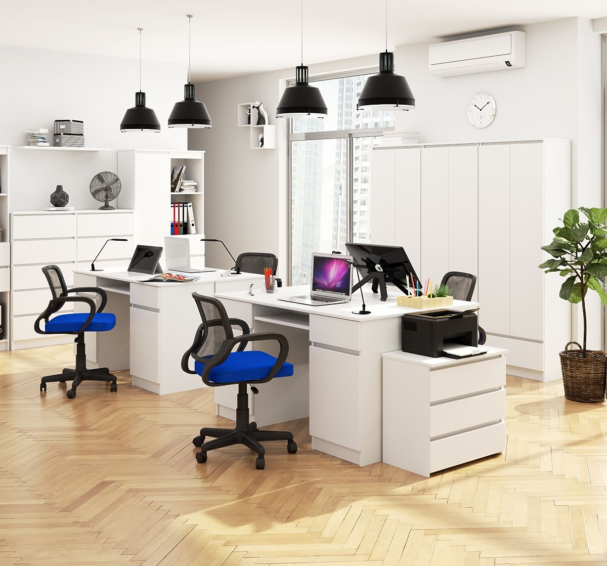Psací stůl A5 je vyroben z vysoce kvalitní, pevné laminované desky o tloušťce 16 mm. Jak korpus, tak čela tohoto nábytku jsou dostupné v módní a univerzální bílé barvě. Nábytek je vybaven praktickou poličkou na klávesnici, dvěma zásuvkami a dvěma skříňkami, což poskytuje značný úložný prostor. Deska stolu má délku 135 cm a hloubku 50 cm, takže je dostatečně velká pro pohodlné umístění monitoru, notebooku nebo psacích potřeb. Tento stůl je prostorný a zároveň kompaktní, protože má výšku 77 cm a každá zásuvka a skříňka je dlouhá 40 cm. Díky svým rozměrům a estetickému, modernímu vzhledu se tento model skvěle hodí jak do studentského pokoje, tak do kanceláře.